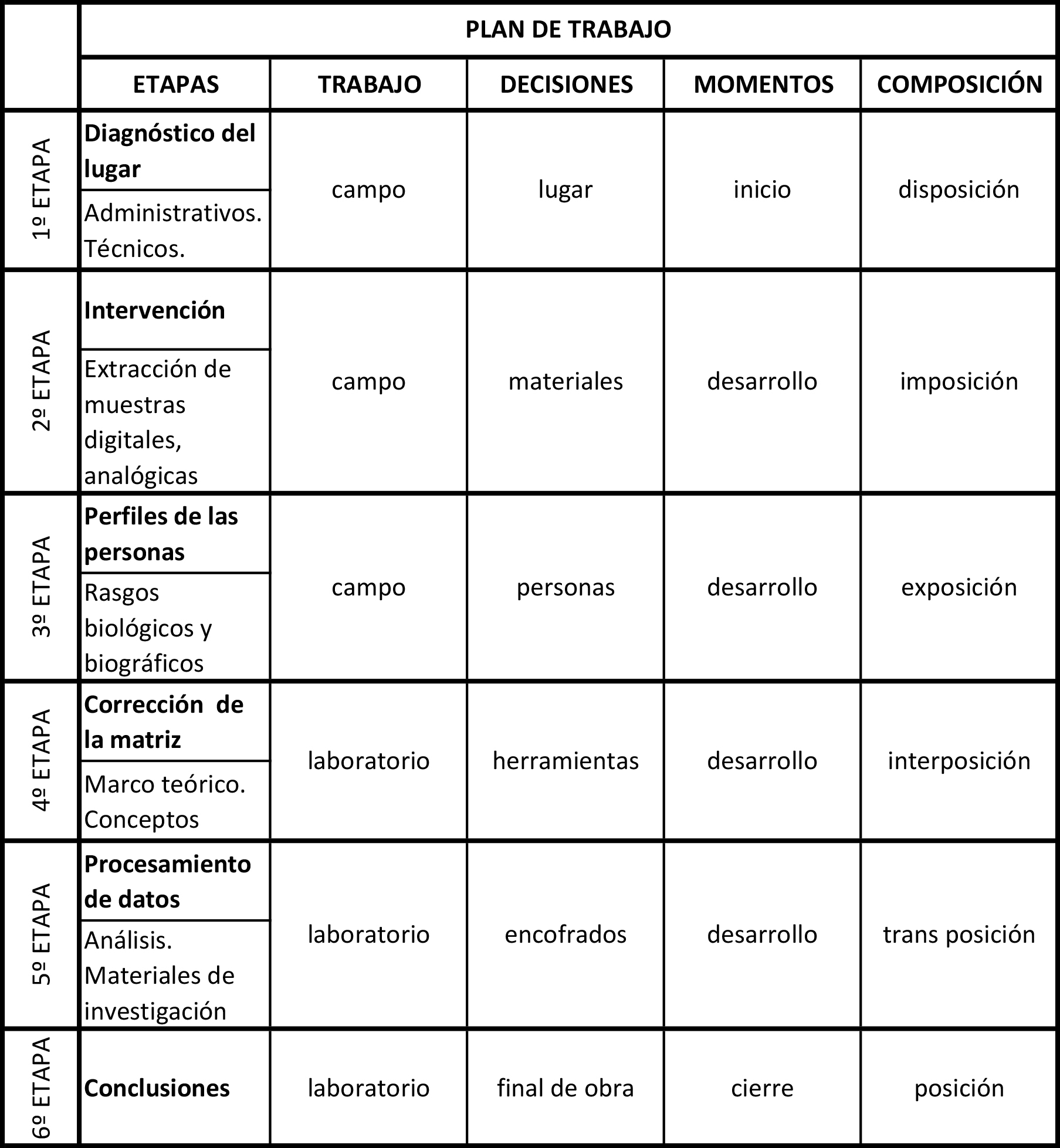 El análisis de las etapas de ejecución del proyecto está acompañado de un eje horizontal de lectura que describe el abordaje de diferentes contextos de situaciones de trabajo. La maduración del proyecto se puede visualizar en las múltiples transformaciones materiales de la obra. En la primera etapa se hace un diagnóstico de la realidad, en la segunda etapa se toman muestras, en la tercera etapa se establecen vínculos con los actores de la realidad, en la cuarta etapa se rectifican las matrices teóricas metodológicas para optimizar el abordaje de la realidad, en la quinta etapa se aplican los protocolos de procesamiento de datos empíricos de las incursiones en la realidad, en la sexta etapa se organizan los hallazgos de la investigación presentando las conclusiones.