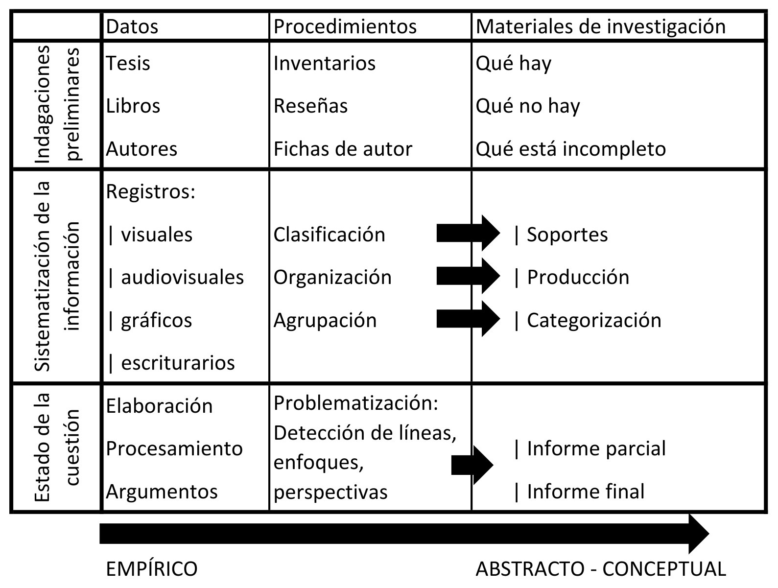 Desde esta idea consideramos una discriminación de datos, procedimientos y materiales de investigación como ejes organizadores del tratamiento. En este sentido la secuencia de las indagaciones preliminares es disponer de los materiales obtenidos en el rastreo y hacer intervenciones que saquen provecho de sus propiedades. Con las tesis se hacen inventario, con los libros reseñas y con los autores, fichas. Al generar estos documentos contamos con un panorama de la realidad que sirve como diagnóstico para señalar lo que hay, lo que no está y lo que resta completar en nuestro tema de estudio.