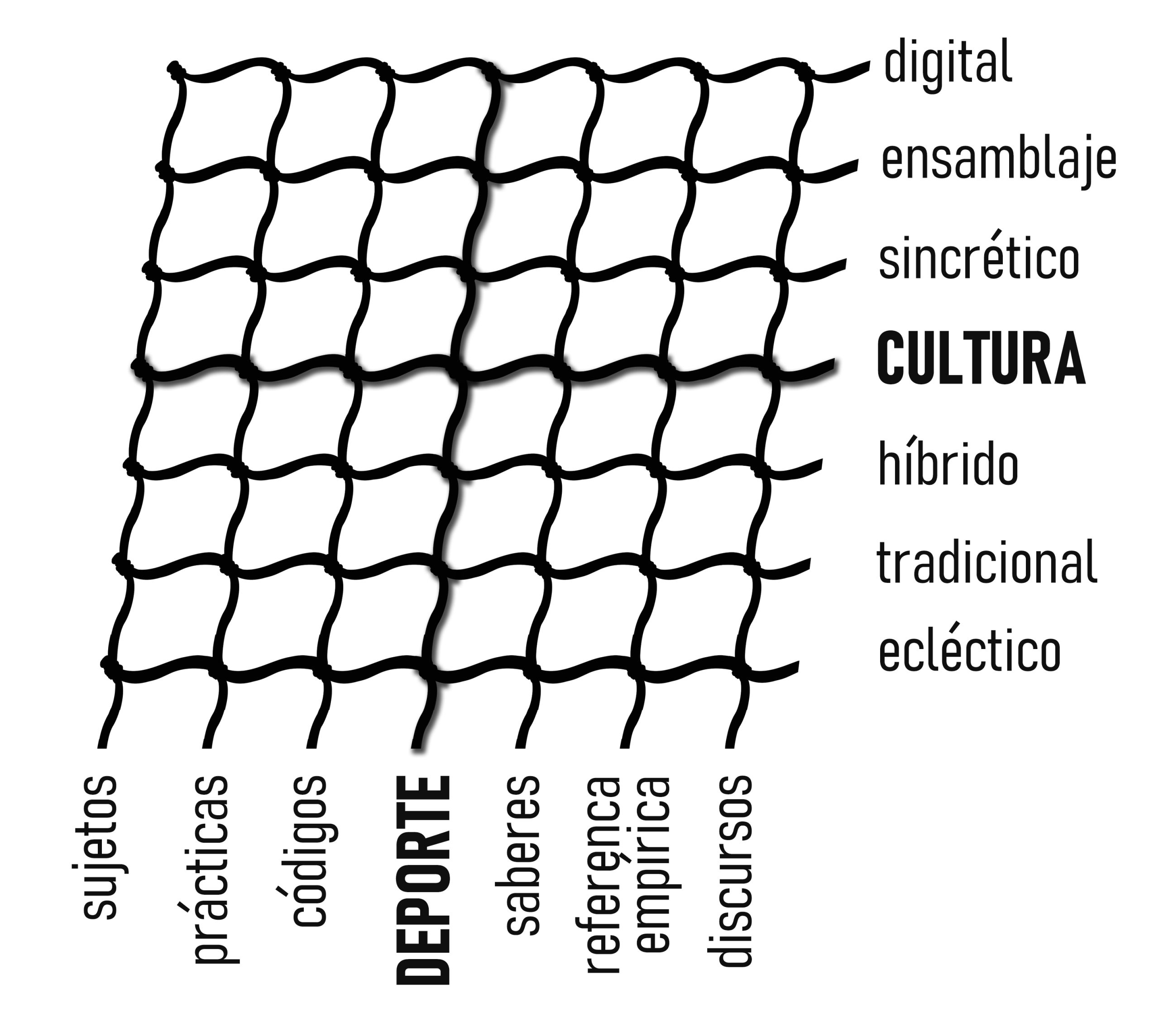 En este gráfico se utiliza el cruce de dos categorías teóricas principales: deporte y cultura. Estas categorías poseen a la vez categorías secundarias. El concepto de deporte agrupa las subcategorías de sujetos, prácticas, códigos, saberes, referencias empíricas y discursos. En el caso de la palabra cultura, contiene las subcategorías digitales, ensamblaje, sincrético, híbrido, tradicional y ecléctico.