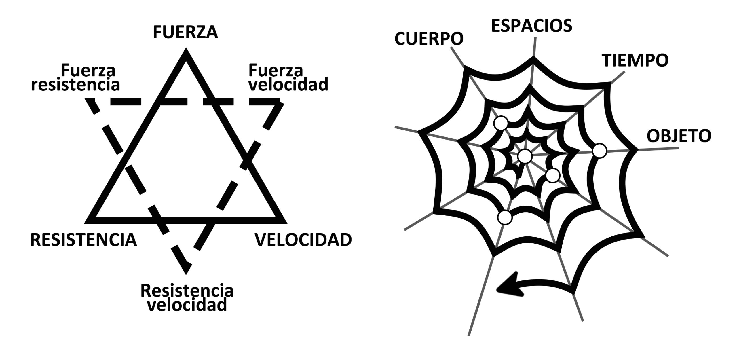 En un segundo lugar el dibujo muestra tres categorías teóricas secundarias: Fuerza resistencia; Fuerza velocidad y Resistencia de la velocidad.