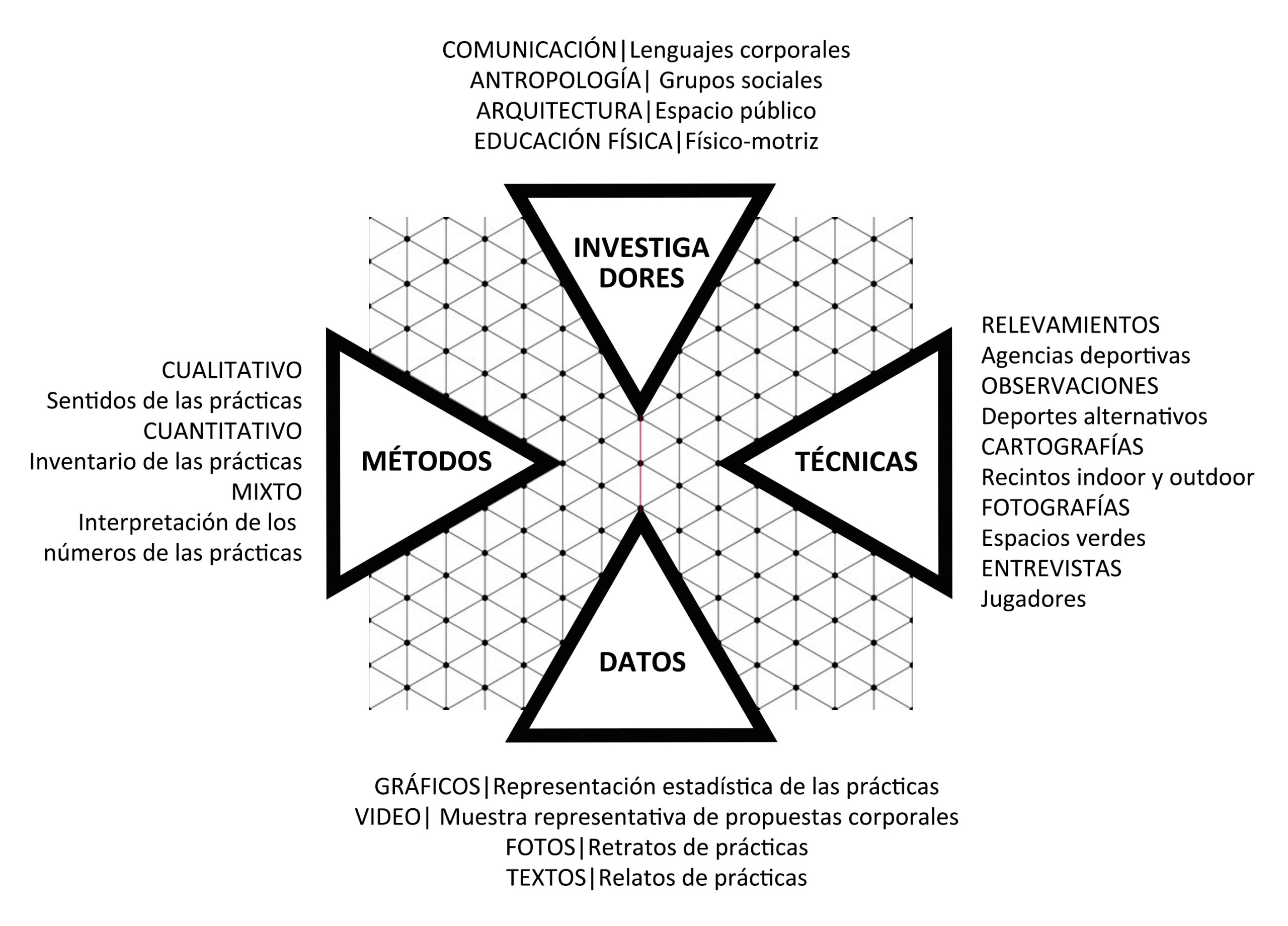Para el empleo de las triangulaciones de técnicas de investigación para desarrollar el trabajo de campo en la ciudad, se utilizan cartografías, relevamientos, observaciones, fotografías y entrevistas. Cada técnica ofrece una versión parcial de la parcela de realidad estudiada. Las técnicas necesitan ser articuladas para complementar sus aportes y en la combinatoria con otras técnicas de investigación producir un relato completo de la ciudad y sus propuestas de prácticas corporales.