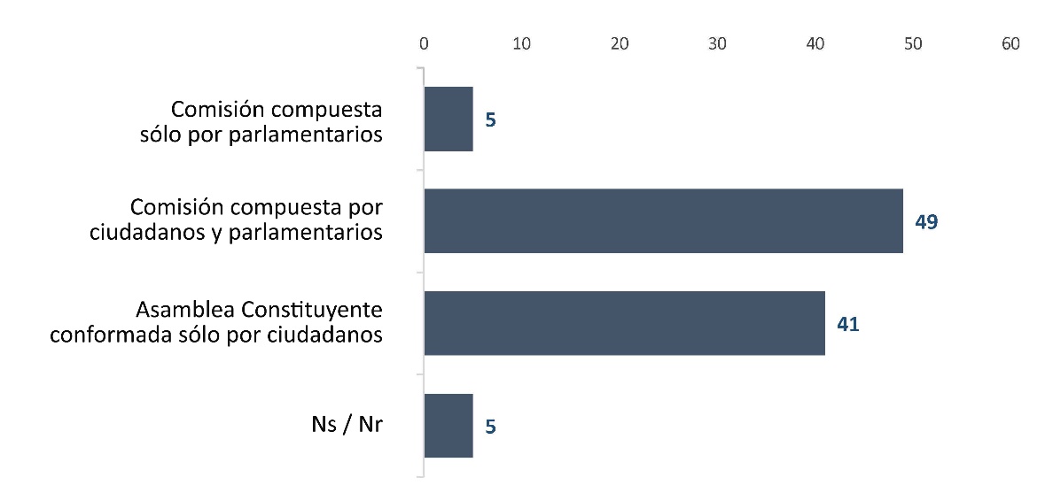 Con respecto a la percepción sobre el mecanismo para elaborar la Constitución, la encuesta realizada en diciembre de 2015 plantea una respuesta cerrada que especifica las opciones de una asamblea constituyente compuesta exclusivamente por ciudadanos, una comisión compuesta solo por parlamentarios, o una comisión mixta entre parlamentarios y ciudadanos. Esta última concentra la mayoría de las preferencias.