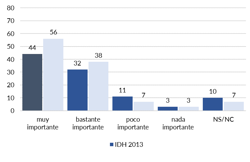 La importancia que se le otorga al cambio de la Constitución aumenta considerablemente en el mismo período: de un 44% que lo consideraba “muy importante” en 2013, frente a un 56% en 2016. Menos de un 10% de las personas entrevistadas considera que el cambio es “poco” o “nada” importante. Cabe considerar, también, que una proporción relativamente baja de las personas encuestadas no tiene opinión frente a este tema, o prefiere omitirla: un 10% en 2013, que desciende al 7% en 2016; es decir, nueve de cada diez personas tiene una posición tomada respecto de un proceso de cambio.