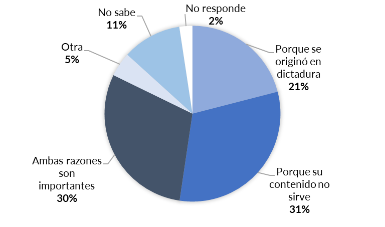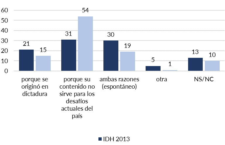 Cabe destacar que la Encuesta de Desarrollo Humano incluye una pregunta referida a las razones para cambiar la Constitución, planteando dos alternativas que aluden a su origen en dictadura y a la vigencia de su contenido. Esta última condensa la mayor cantidad de respuestas (31,4%) aunque en porcentaje muy próximo a quienes consideran que “ambas razones son importantes” (29,9%).