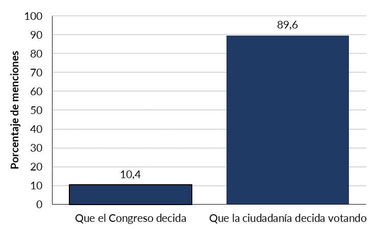 El mismo estudio incluye preguntas sobre el mecanismo de cambio constitucional; su formulación responde a la coyuntura del año 2016, cuando ya había propuestas gubernamentales en marcha en torno al Proceso Constituyente. Al preguntar quién debería redactar la nueva Constitución, la opción Asamblea Constituyente sigue siendo mayoritaria (43%) aunque muy próxima a la posibilidad de una convención conformada entre representantes del Congreso y de la ciudadanía (41%). Solo un 6% se inclina por una comisión parlamentaria (PNUD, 2016, p. 72). Sin embargo, al preguntar quién debería decidir entre estos tres mecanismos, un 79% considera que la potestad recae en la ciudadanía y solo un 10% se inclina porque sea el Congreso quien decida.