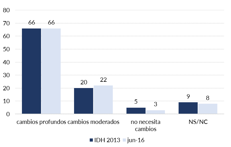 La encuesta Auditoría a la Democracia del PNUD (2016) presenta una comparación de la opinión pública frente al cambio constitucional en cuanto a su importancia y a razones que lo justifican. La percepción sobre la profundidad de cambios que requiere la Constitución se mantiene constante: dos tercios de las personas entrevistadas considera que deben ser profundos.