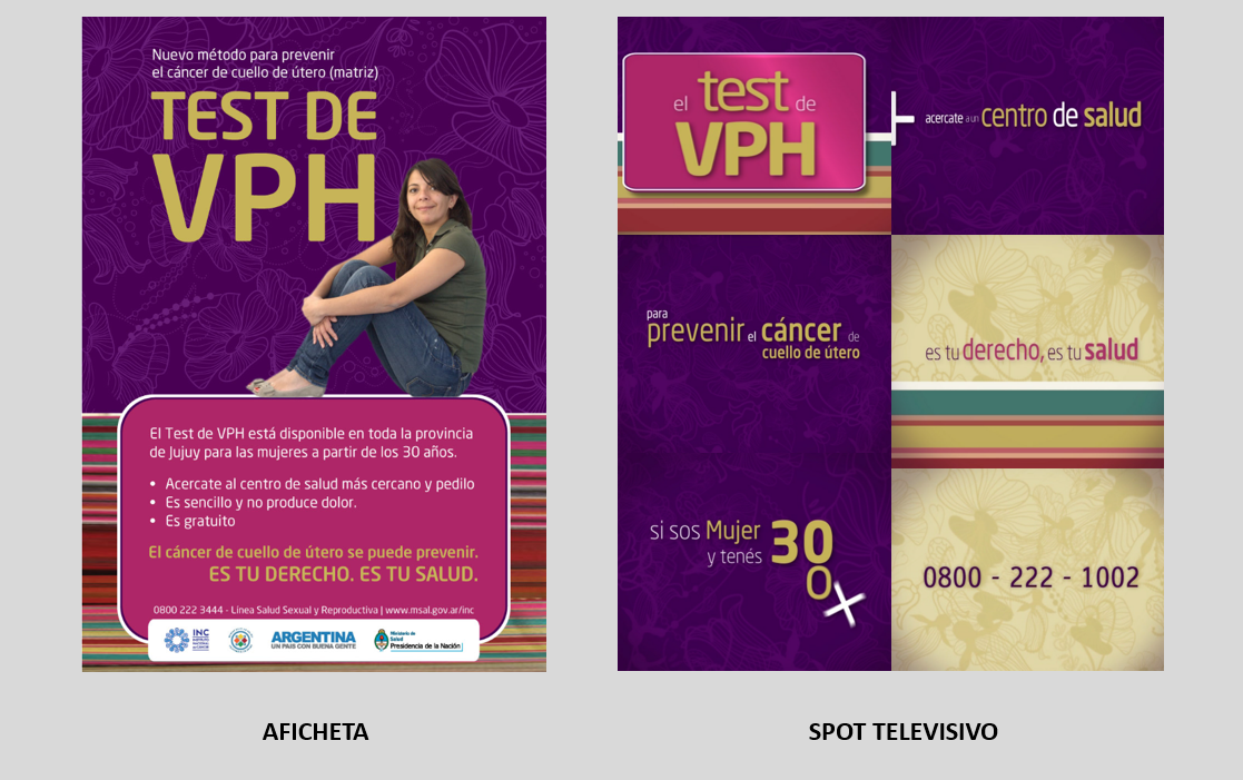 Acompañando la estrategia del test de VPH, en 2012 se implementó una campaña de difusión de esta prueba que tuvo como población destinataria a las mujeres de 30 años y más. Compuesta por diversos soportes de comunicación (radio, televisión y gráfica) tuvo como objetivo principal informar acerca de la disponibilidad del test de VPH en los establecimientos públicos de salud. La acción comunicacional acompañó los propósitos programáticos con respecto al tamizaje, promoviendo que las mujeres se realicen esta prueba para lograr una alta cobertura. Además, la campaña ofrecía información sobre el significado de los posibles resultados de la prueba y los pasos a seguir en base a los mismos.