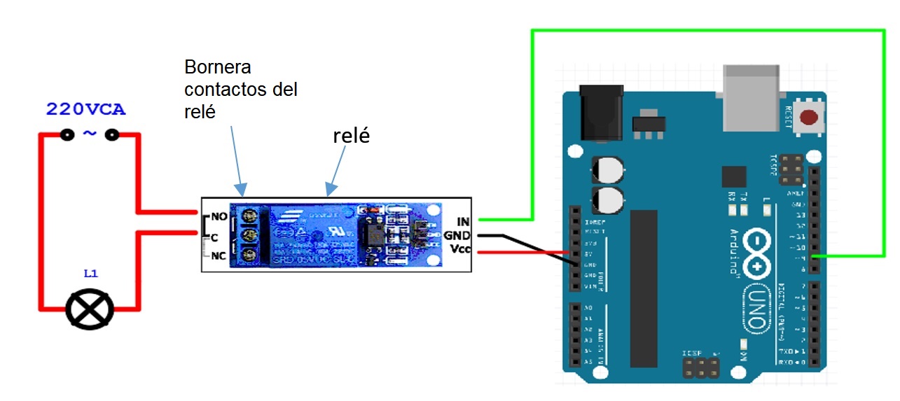 IMPORTANTE: al hacer conexiones a 220VCA (220 voltios de corriente alterna) no pueden cometerse errores. En caso de error, Ud. puede electrocutarse o quemar el Arduino. Extreme las precauciones.