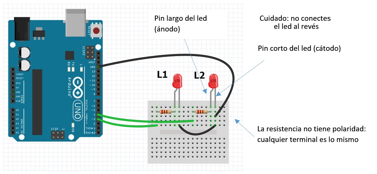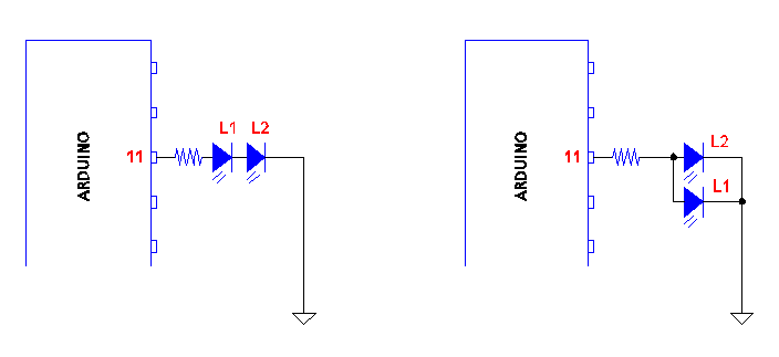 Si se conectan dos leds en serie con una resistencia en el mismo pin, o bien se encienden los dos leds juntos, o bien se apagan los dos juntos, o sea, no se puede hacer un control individual. Lo mismo sucede si se conectan dos leds en paralelo.