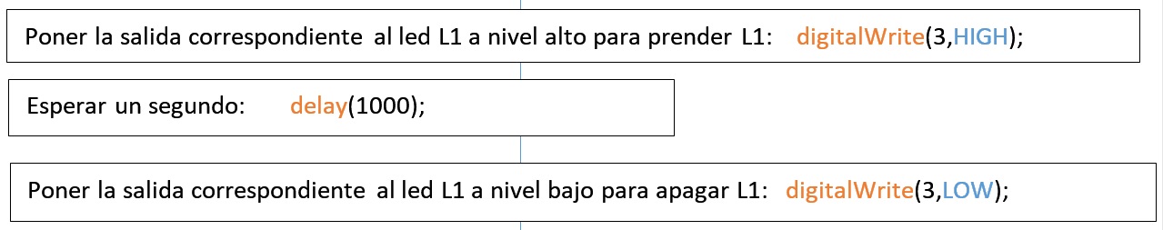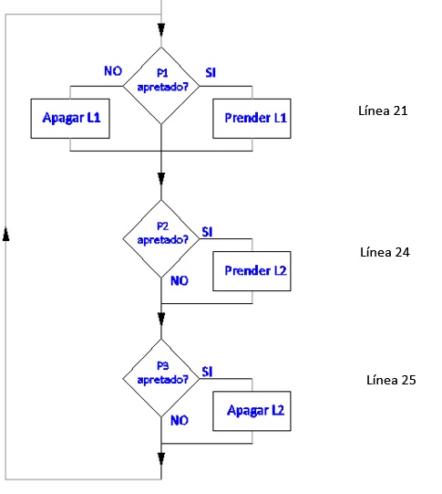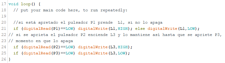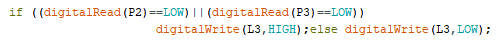 Se quiere que si el pulsador P2 está apretado o si el pulsador P3 está apretado (o ambos) prenda L3, sino que se apague. Hay que usar la función lógica OR (o) que se escribe || como se muestra a continuación.