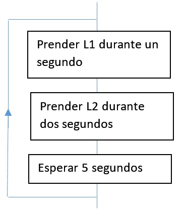 L1 se maneja con los pulsadores P1 y P2, mientras que L2 se maneja con P3. L1 se enciende al pulsar momentáneamente P1 y se apaga al pulsar momentáneamente P2. En cambio, L2 se mantiene encendido mientras esté presionado P3, y se apaga al soltar P3 y se mantiene apagado mientras P3 esté suelto.
