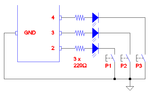 Se tienen dos pulsadores P2 y P3 que entregan nivel bajo cuando están apretados y un led L3 que se prende con nivel alto.