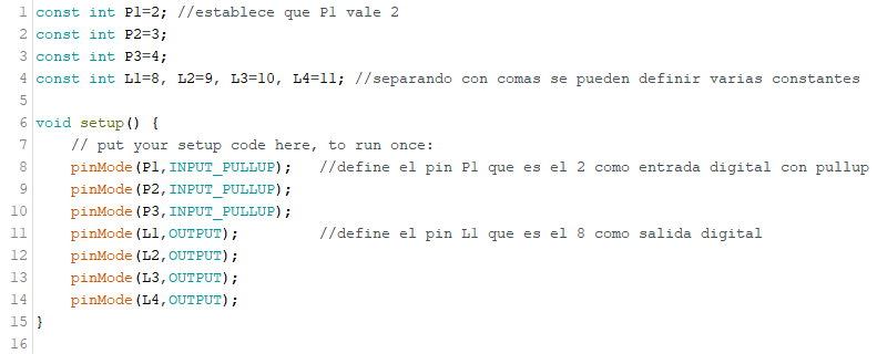 setup() : todo lo que se escriba en esta sección se ejecuta una sola vez al arrancar Arduino. Se pone la configuración de cómo se van a usar los pines, se inicializa la comunicación serie, se establecen los valores iniciales de las variables.