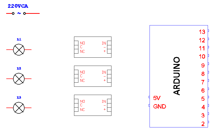 - Dibujar un circuito con Arduino y tres módulos de relés que controle a tres lámparas L1, L2, L3 de 220VCA. Tome como referencia el siguiente dibujo.