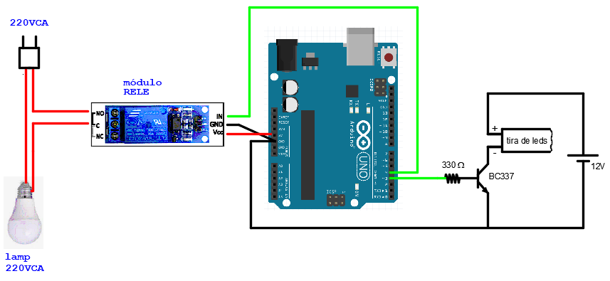 Si se carga el sketch ejemplo 1b, veremos encender y apagar la lámpara y la tira de leds. Vemos que el mismo software actúa sobre diferente hardware.