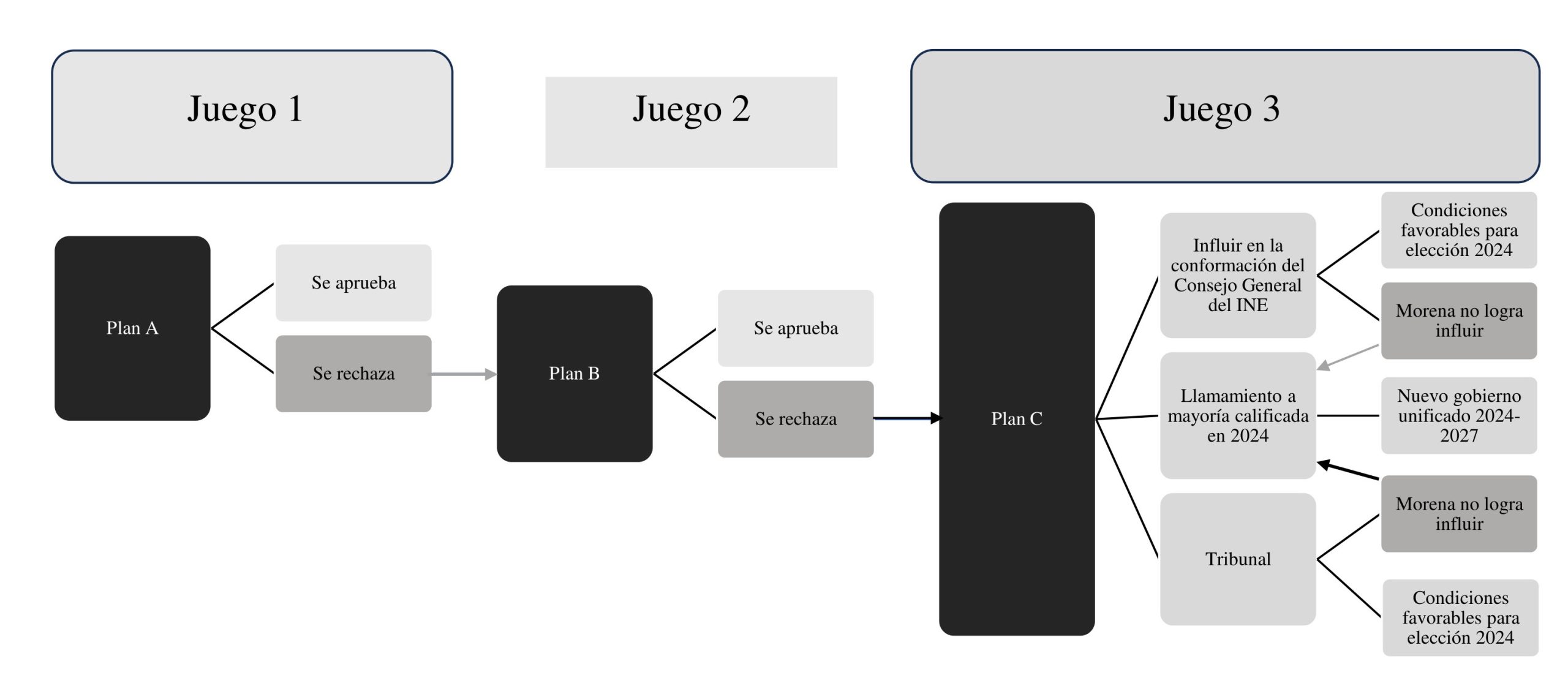 El escenario más favorable para la oposición, retrospectivamente, era negociar el Plan A para lograr tener influencia en las transformaciones al sistema electoral. Sin embargo, al no contar con la información completa con la que sí contaba el presidente, es decir que se tenía en mente un Plan B y un Plan C, que parece ser el objetivo final desde el inicio, no pudieron mantener su posición para influir en la reforma electoral.