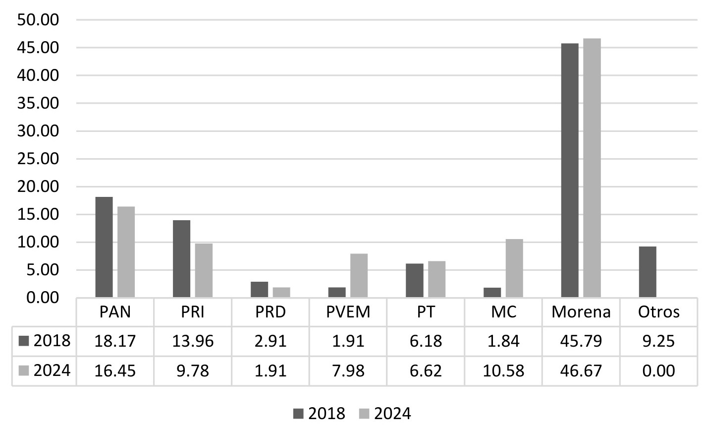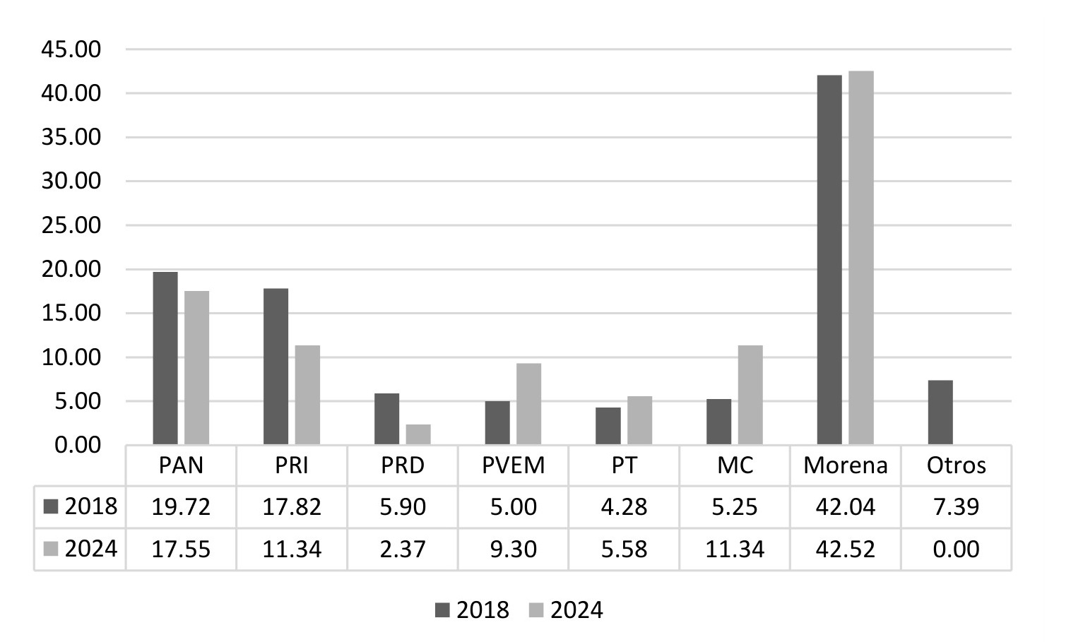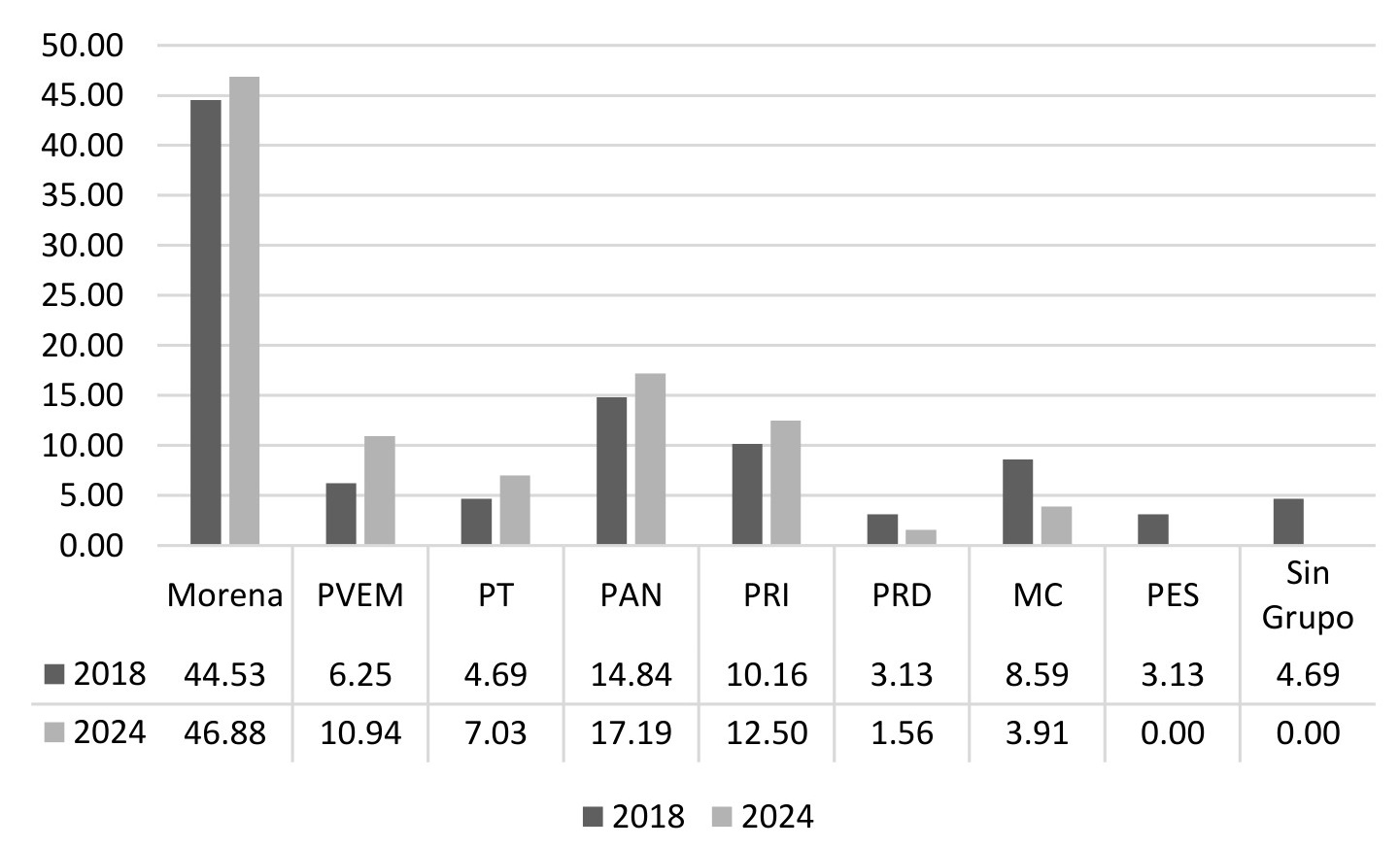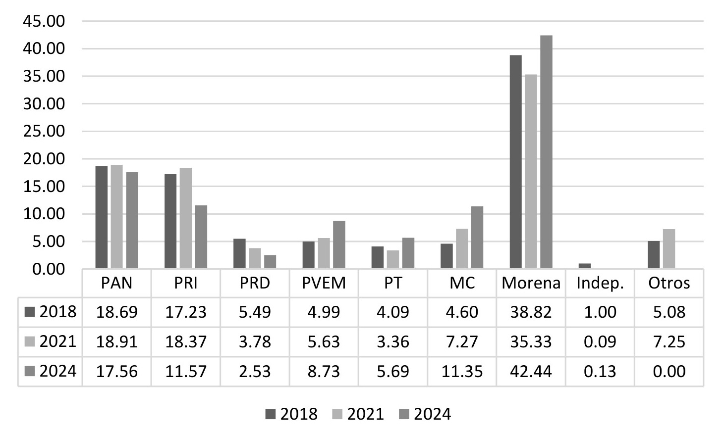 La oposición, por otro lado, obtuvo sus números más bajos. Si consideramos todos los partidos no aliados a Morena, la suma equivalía en 2018 a 36.20 %, en 2021 a 45.40 % y en 2024 a 27.20 %. Es particularmente llamativo que la segunda bancada más grande para la Legislatura que inicia en 2024 es la del PVEM, que desplaza al PAN.