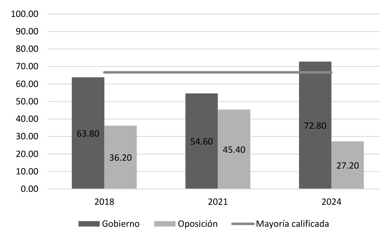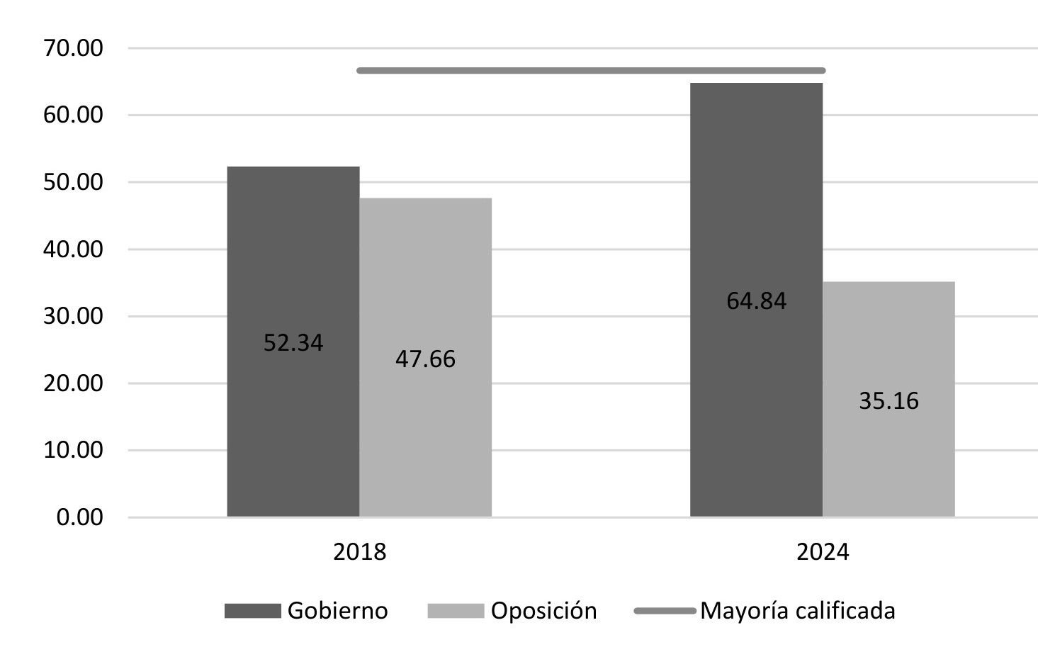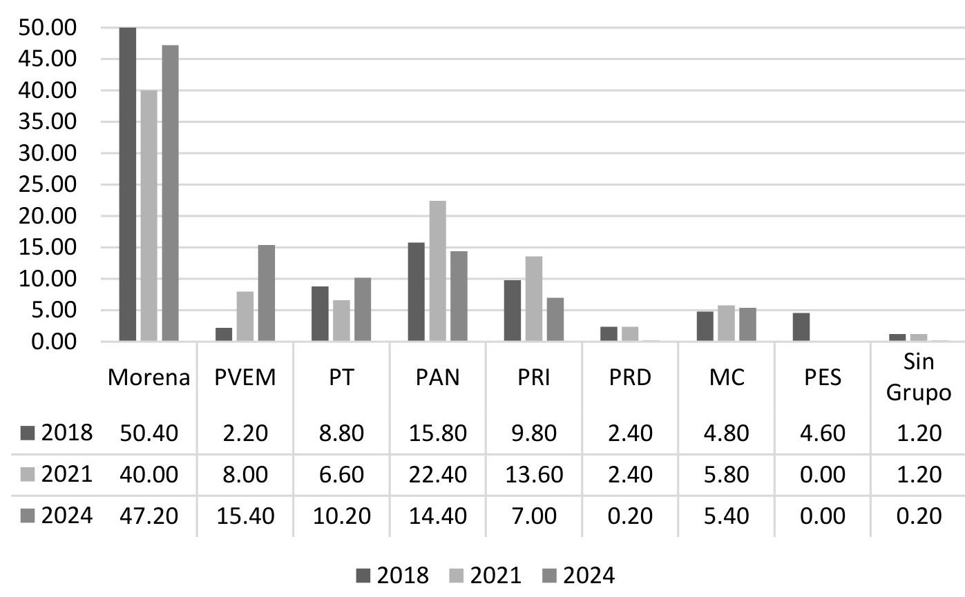 Estos resultados influyen de forma directa en la composición del Congreso. Con los datos de la conformación inmediatamente tras las elecciones, es decir, la distribución de curules generada por el INE sin reflejar los movimientos para cambiar de una bancada a otra por parte de las y los legisladores, en lo que respecta a la Cámara de Diputados, como se aprecia en la gráfica 4, la elección de 2024 permite, por primera vez, que la coalición morenista cuente con mayoría calificada, como hemos mencionado. La suma de los tres partidos equivale a 72.80 %, siendo necesario el 66 % para poder aprobar reformas constitucionales. En 2021 la suma equivalía a 54.60 %, y en 2018 a 63.80 % (en este caso, contando al Partido Encuentro Social dentro de la coalición y no al PVEM, que se integró a ella en 2021).