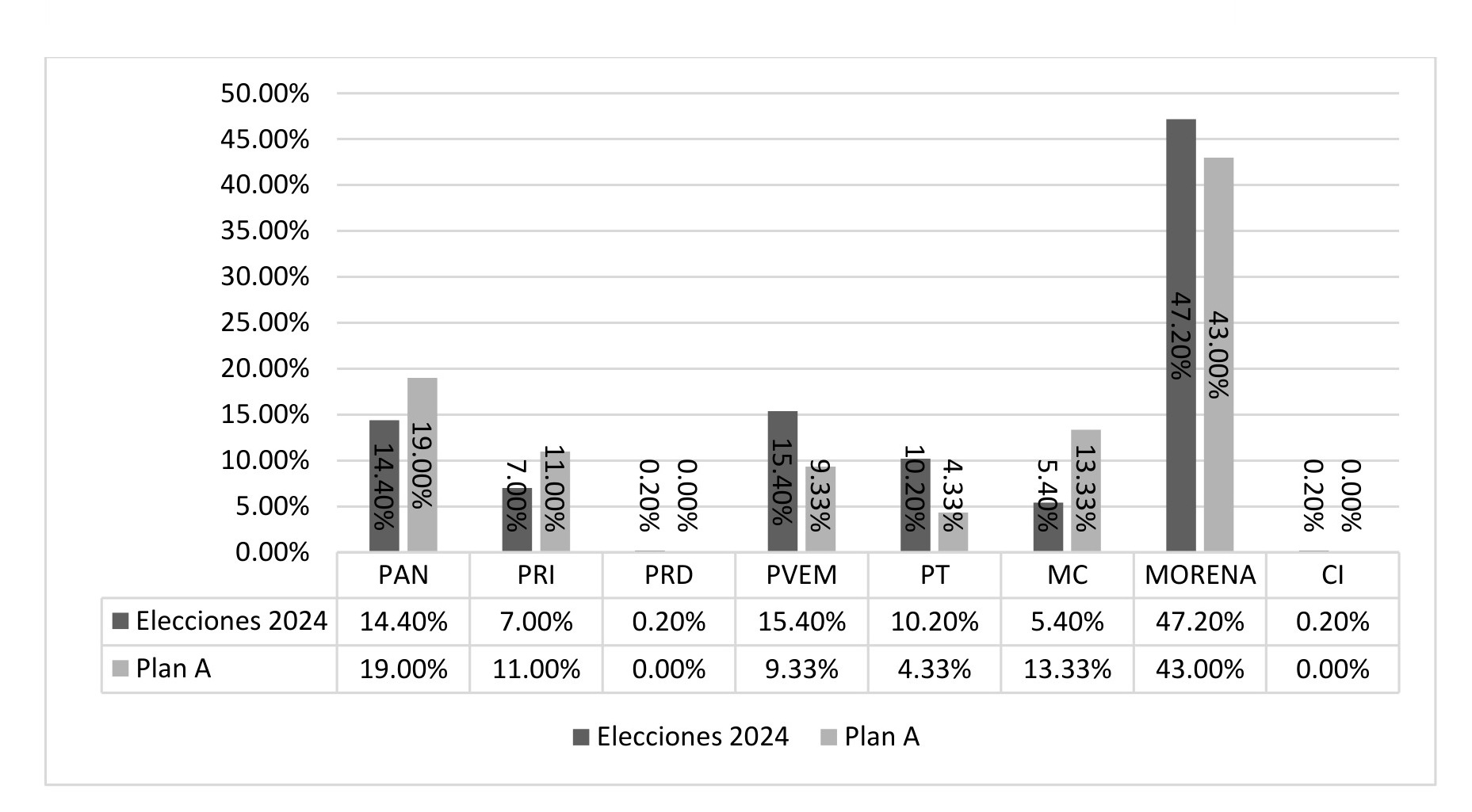 Resulta relevante comparar los resultados obtenidos tras las elecciones de 2024, una vez puesto en marcha el Plan C, con los que se hubieran obtenido de haber fructificado el Plan A, eliminando las diputaciones de Mayoría Relativa, dejando en su lugar un Congreso conformado por Representación Proporcional.