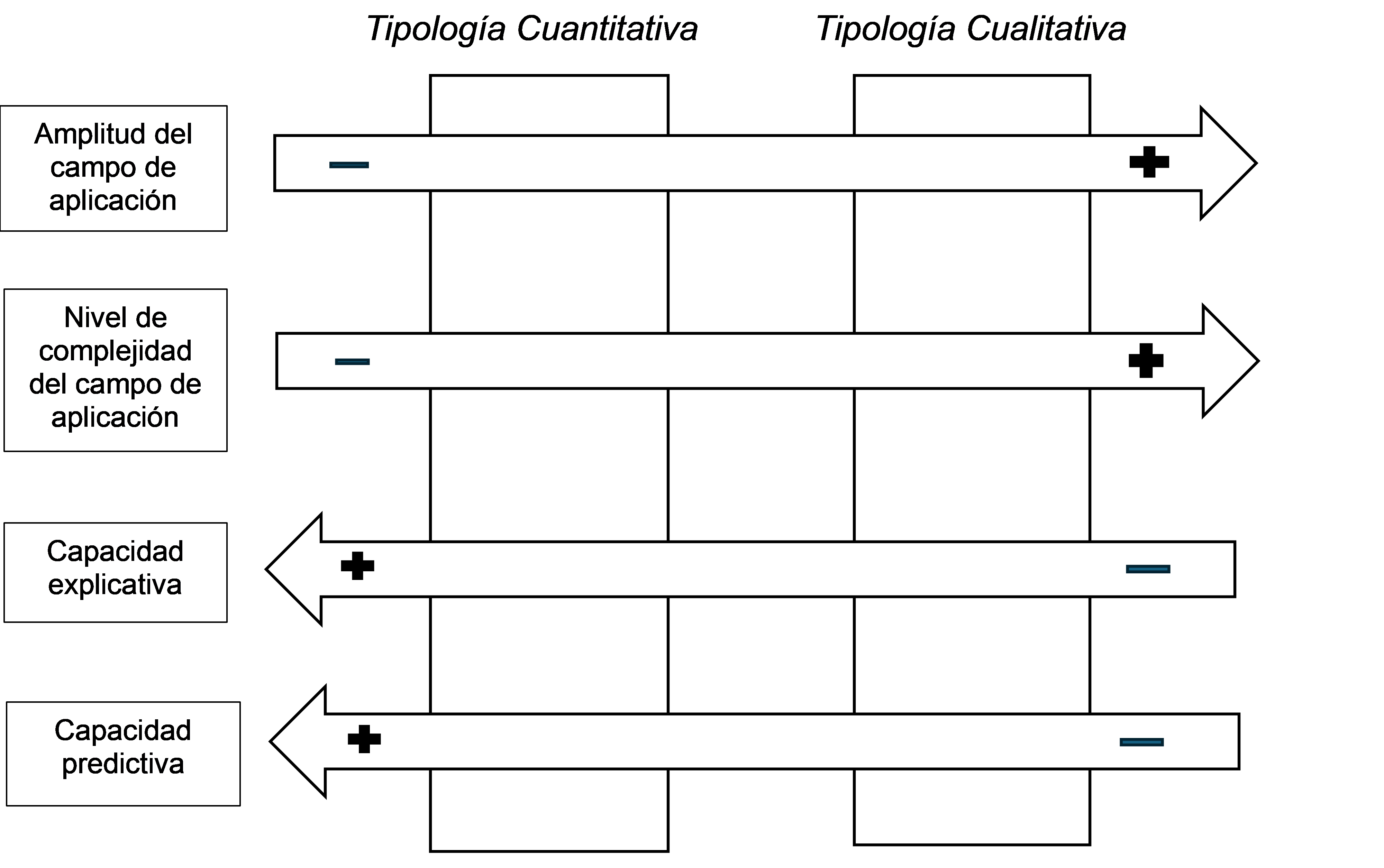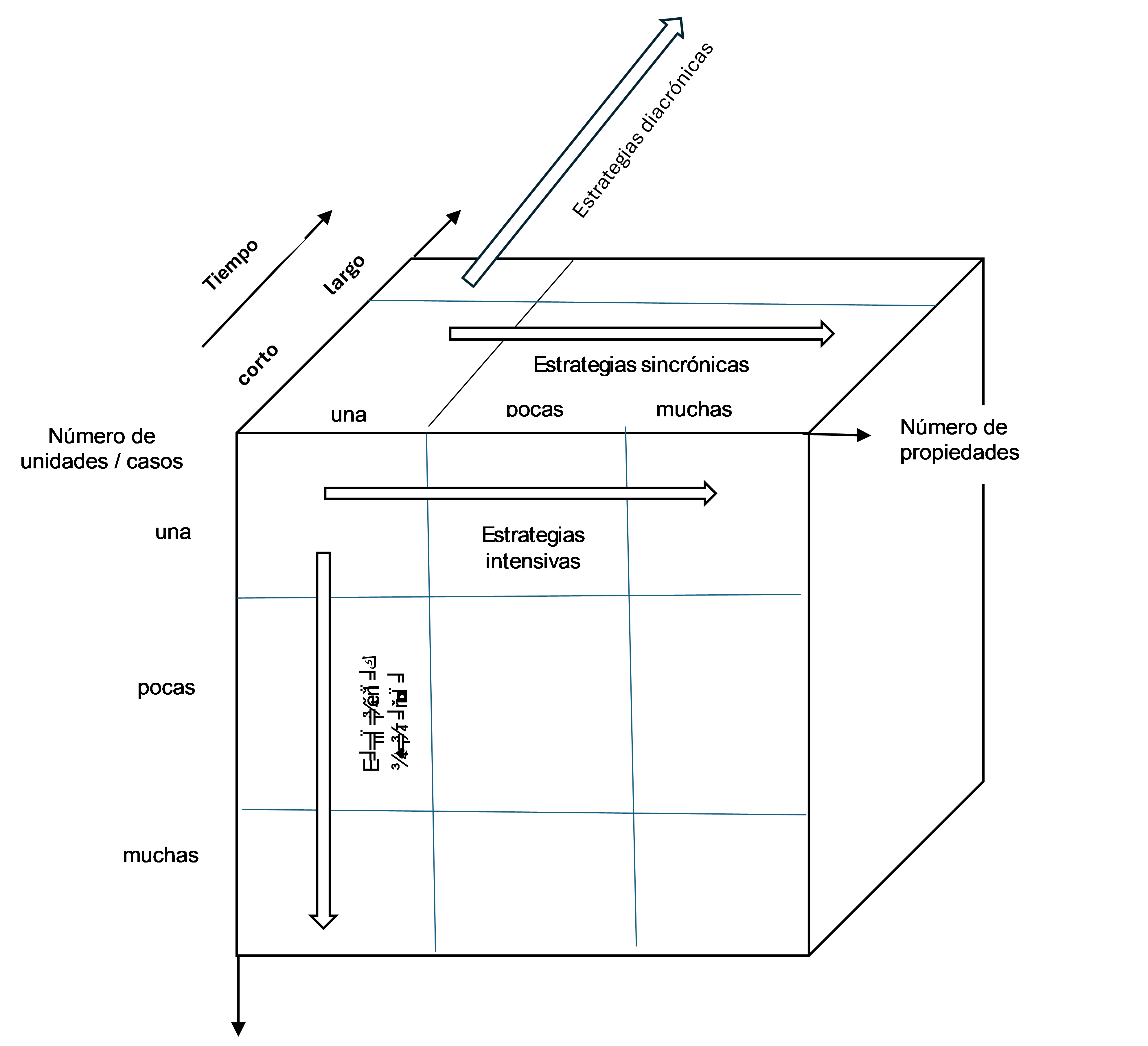 Siguiendo a Anna Estany en la figura 1 que se expone a continuación, las comparaciones que promueven el uso extensivo e intensivo de los factores cuantitativos y cualitativos implican que el primer rasgo (amplitud) se puede ver fortalecido precisamente mientras más casos tengamos (n-grande con muchos casos), en tanto que los elementos cualitativos (si se mantiene una n-pequeña con pocos casos o uno solo) se desplazan hacia la obtención intensiva de elementos más variados, aunque no haya tanta oportunidad para repetir observaciones con frecuencia, lo que nos conduce precisamente a identificar los factores de observación sincrónica (el caso o casos ubicados en un mismo contexto temporal), y las observaciones diacrónicas (que implican que el caso o casos observados puedan abordarse desde dos momentos temporales distintos), lo que también ayuda a señalar factores de variabilidad y tendencias con respecto a predecir los comportamientos o posibles cursos de acción que puedan manifestar los objetos de estudio.