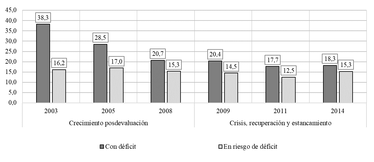 Hasta aquí, consideramos las variaciones del ingreso familiar de fuente laboral según la posición económico-ocupacional del hogar evaluada a partir de la inserción de su PSH. Este análisis nos proporcionó información relevante acerca del patrón de crecimiento económico y del modo en que los hogares enfrentaron tal contexto. Sin embargo, no sabemos aún en qué medida los ingresos laborales bastaron para satisfacer las necesidades materiales de los hogares, tomando en cuenta los requerimientos de sus integrantes. Tampoco conocemos qué desigualdades se observaron al respecto. Podría ocurrir que los cambios positivos en la distribución del ingreso laboral no hayan bastado –al menos, entre algunos grupos de hogares– para evitar la exposición al déficit de capacidades de subsistencia.