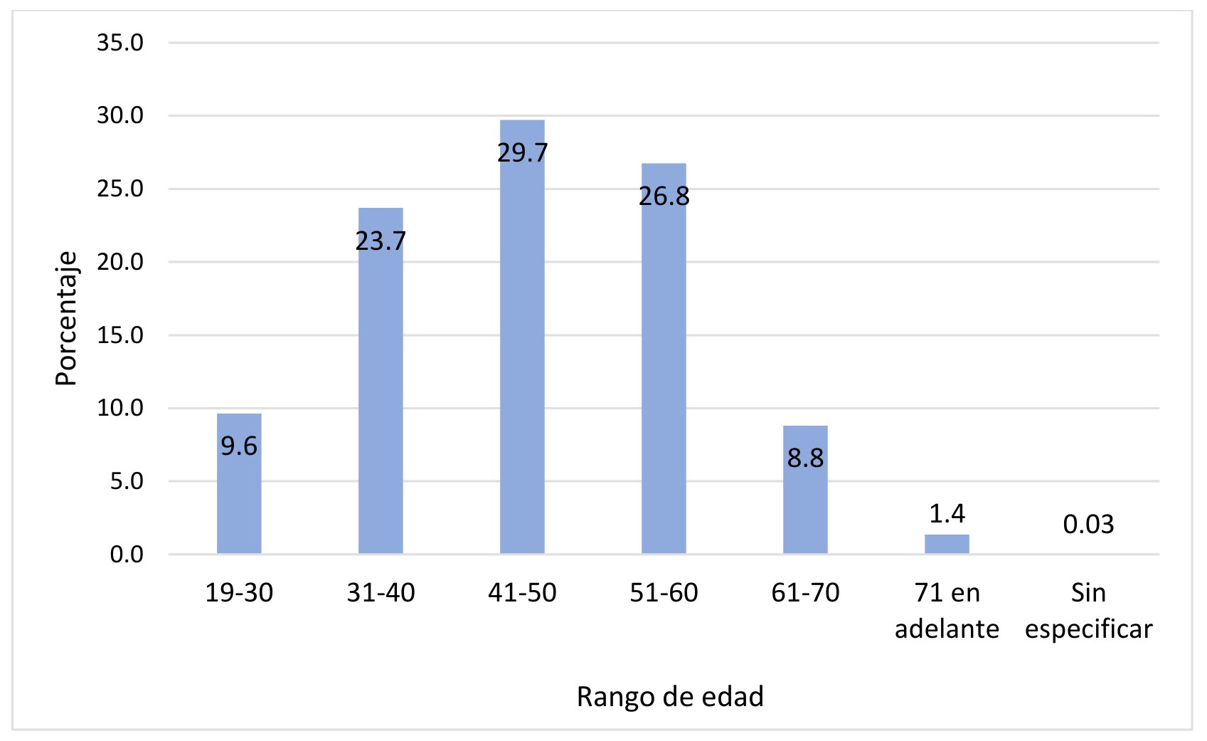 Para el año 2019, permanecen activas 50 599 madres comunitarias (ICBF, 2019a), de las cuales un 23.7% se encuentran entre los 31 y 40 años, un 56.5% tienen entre 41 y 60 años, y un 10.2%, es decir, cerca de 5000 madres comunitarias, tienen más de 60 años y continúan trabajando porque no tuvieron contratos ni seguridad social que les aseguraran una pensión por vejez (Figura 3).