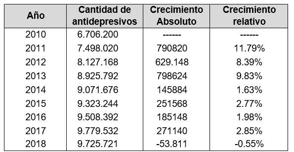 La tabla indica que el crecimiento relativo entre 2010 y 2018 es de 45.02 %. Esta tendencia ya venía de años anteriores, si consideramos los años comprendidos entre 2004 y 2015 registra un aumento del 111.30%. A excepción del 2018, la tendencia es siempre alcista, a pesar del incremento en el precio, si bien a partir de 2014 hay una disminución significativa en los porcentajes (Confederación Farmacéutica Argentina, 2016). Este aumento de consumo de antidepresivo manifiesta la relevancia que adquiere la estrategia farmacológica para afrontar los malestares y la mayor demanda de la población para gestionar sufrimientos psíquicos.