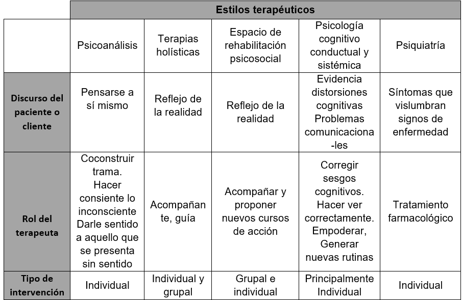 Todos los estilos terapéuticos están embarcados en propósitos relativamente comunes: buscan objetivar lo subjetivo. Intentan comprender qué les sucede a las personas que consultan para desarrollar una estrategia terapéutica. Requieren una hermenéutica práctica, esto es, criterios para escuchar y resignificar las voces y, de esta manera, contribuir a mejorar la salud del consultante. En este escenario, es posible reconocer un amplio conjunto de discursos y técnicas que tienen por objeto modificar lo que piensan y sienten quienes solicitan sus servicios.