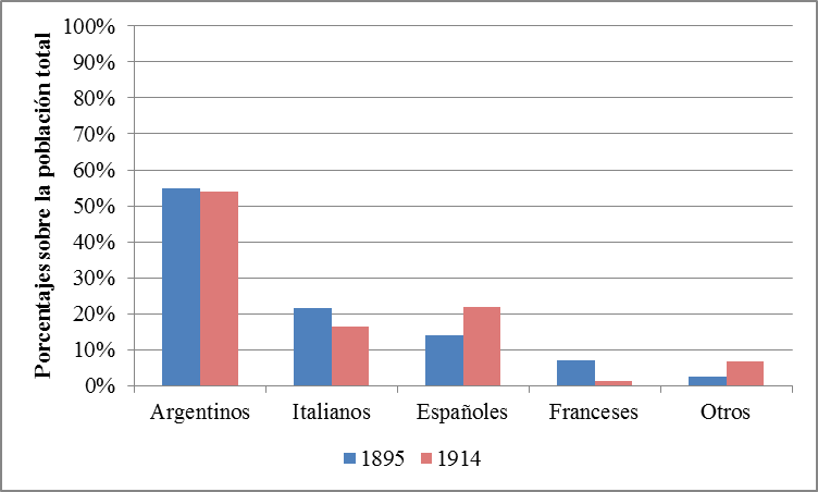 Los censos nacionales de 1895 y 1914 ponen en evidencia el ya conocido predominio a nivel nacional de los siguientes tres grupos: italianos, españoles y franceses.[7] Los primeros constituían más del 10 % de la población total tanto en 1895 (12,5 %) como en 1914 (11,8 %). Los españoles, por su parte, representaban apenas el 5 % al momento del segundo censo nacional y ya habían superado el 10 % en 1914. Estos datos pueden ser vinculados con la centralidad de la inmigración española alrededor de los años del Centenario, en una coyuntura caracterizada por la combinación de la sostenida expansión económica argentina tras su recuperación de la crisis de 1890 y la puesta en funcionamiento de mecanismos propios de atracción por parte de una colectividad fuertemente asentada (Fernández, 1991, pp. 59-66). Los franceses constituyeron un grupo minoritario respecto de los anteriores. Apenas superaban el 2 % de la población total en 1895 y disminuyeron su importancia al 1 % en el censo siguiente.