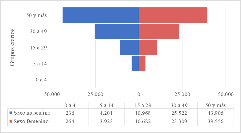 Una situación semejante se registra en el ámbito provincial, aunque en este caso los extranjeros se concentran en edades activas aún en menor medida (38 % entre los varones y 40,5 % entre las mujeres). Las cifras correspondientes a los nativos muestran un 47,4 % para los hombres y 46,8 % entre las mujeres. Por su parte, en el nivel nacional, las cifras correspondientes a los inmigrantes son del 38,4 % entre los varones y el 37,5 % entre las mujeres. En el caso de los nativos son del 42,7 % para los hombres y 43,3 % en el caso de las mujeres (Dirección Nacional de Estadísticas y Censos, s. f. a, pp. 4-7; Dirección Nacional de Estadísticas y Censos, s. f. c, p. 10).