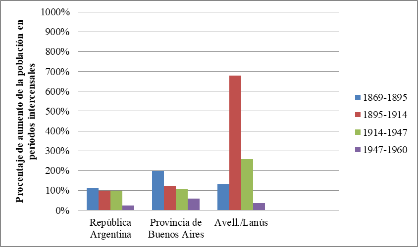 Por otra parte, es pertinente destacar los datos correspondientes al segundo periodo intercensal, a partir de los cuales se puede apreciar claramente un aumento del crecimiento relativo de la población en la medida que reducimos la escala de análisis, acercándonos al ámbito municipal. Fue en esta etapa que el partido de Avellaneda protagonizó un extraordinario crecimiento poblacional (679,3 %), varias veces superior al registrado por el conjunto del país y el total de la provincia, que lo constituyó en el partido más poblado del territorio bonaerense, por encima de su capital, La Plata (Poder Ejecutivo Nacional, 1916b; p. 3; Poder Ejecutivo Nacional, 1916d, p. 469).