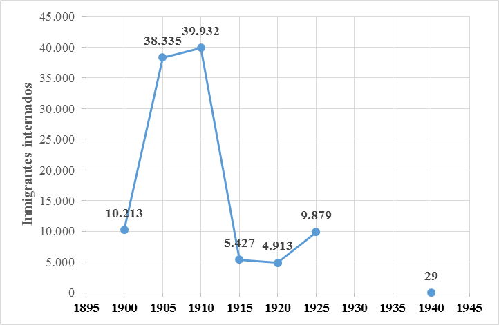 - Es preciso señalar que los datos con los que contamos para 1914 repiten idénticas cifras de inmigrantes internados por grupo nacional para los meses de mayo y junio. A pesar de este posible error, consideramos que la cifra general aporta un panorama apropiado de la inmigración internada en dicho año. Asimismo, no contamos con los datos desagregados por nacionalidad para 1925.↵