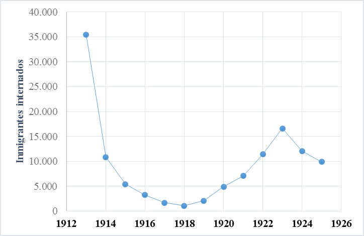 - A continuación, exponemos las cifras exactas de inmigrantes internados en la provincia de Buenos Aires, por año: 1913 (35.408); 1914 (10.848); 1915 (5427); 1916 (3272); 1917 (1701); 1918 (1096); 1919 (2114); 1920 (4913); 1921 (7106); 1922 (11.422); 1923 (16.632); 1924 (12.093); 1925 (9879).↵