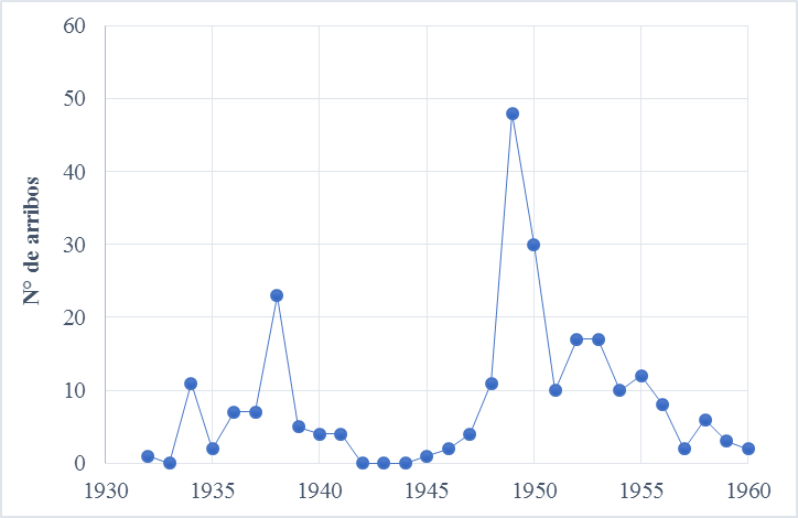 - Los números de ingresos por año a los que hace referencia el gráfico son los siguientes: 1932 (1); 1933 (0); 1934 (11); 1935 (2); 1936 (7); 1937 (8); 1938 (23); 1939 (5); 1940 (4); 1941 (4); 1942 (0); 1943 (0); 1944 (0); 1945 (1); 1946 (2); 1947 (4); 1948 (11); 1949 (48); 1950 (30); 1951 (10); 1952 (17); 1953 (17); 1954 (10); 1955 (12); 1956 (8); 1957 (2); 1958 (6); 1959 (3); 1960 (2). Cabe aclarar que se consignaron dos ingresos distintos de la misma persona. En este caso, fueron considerados por separado.↵