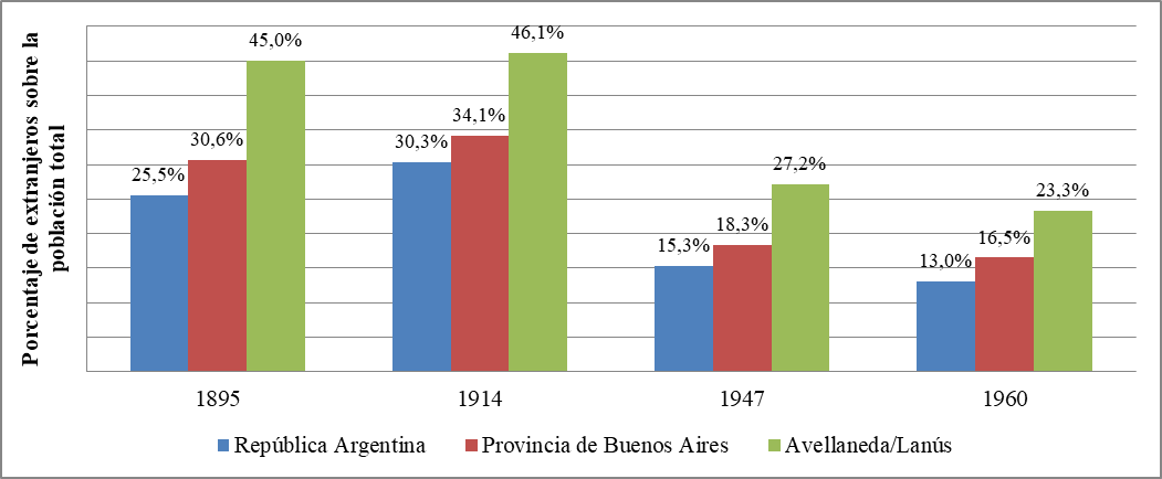 En lo que respecta a la presencia de habitantes extranjeros en el conglomerado urbano Avellaneda/Lanús, podemos sostener lo siguiente: por un lado, existió una evolución semejante a la de la nación y la provincia en cuanto a la considerable reducción de su importancia respecto de la población total según la información ofrecida por los dos últimos censos nacionales; sin embargo, el porcentaje de extranjeros en dichos partidos fue siempre mayor a los registrados en los niveles nacional y provincial. Este superó el 45 % en 1895 y 1914, y se colocó por sobre el 23 % en 1947 y 1960.