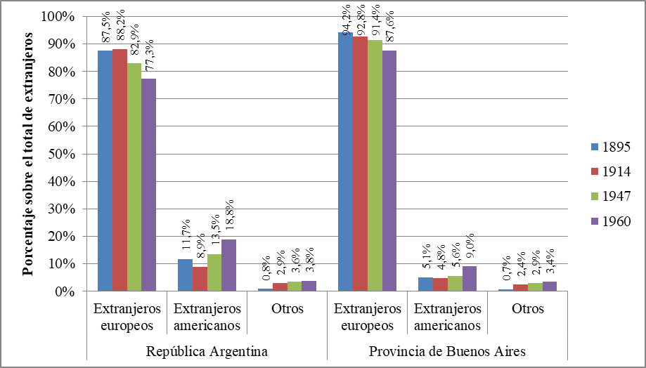Una primera observación refiere al hecho de que los mayores porcentajes de extranjeros sobre la población total se registraron en los dos primeros censos nacionales considerados. En 1895, los extranjeros representaban el 25,5 % del total de la población de la República Argentina, más del doble de la importancia registrada en 1869, antes del auge de la etapa masiva de las migraciones transatlánticas. En 1914, su peso respecto de la población total trepaba al 30,3 %. Los últimos dos censos considerados, por su parte, ofrecen el registro de un marcado decrecimiento del nivel de incidencia de los extranjeros, de 15,3 % y 13 % de la población total en 1947 y 1960 respectivamente.