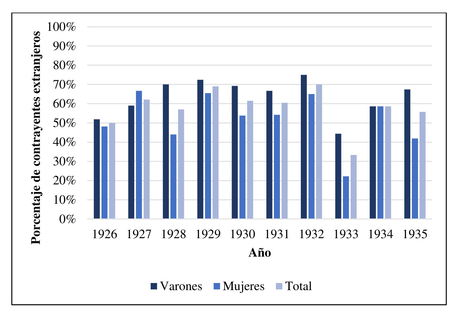 En primer lugar, podemos observar que el porcentaje de contrayentes de origen extranjero es muy importante, rondando el 57 % (358 contrayentes). Asimismo, si realizamos un análisis anual, observamos que este se ubicó por encima del 50 % a lo largo de todo el periodo, a excepción del año 1933 (31,5 %), como queda ilustrado en el Gráfico 10.