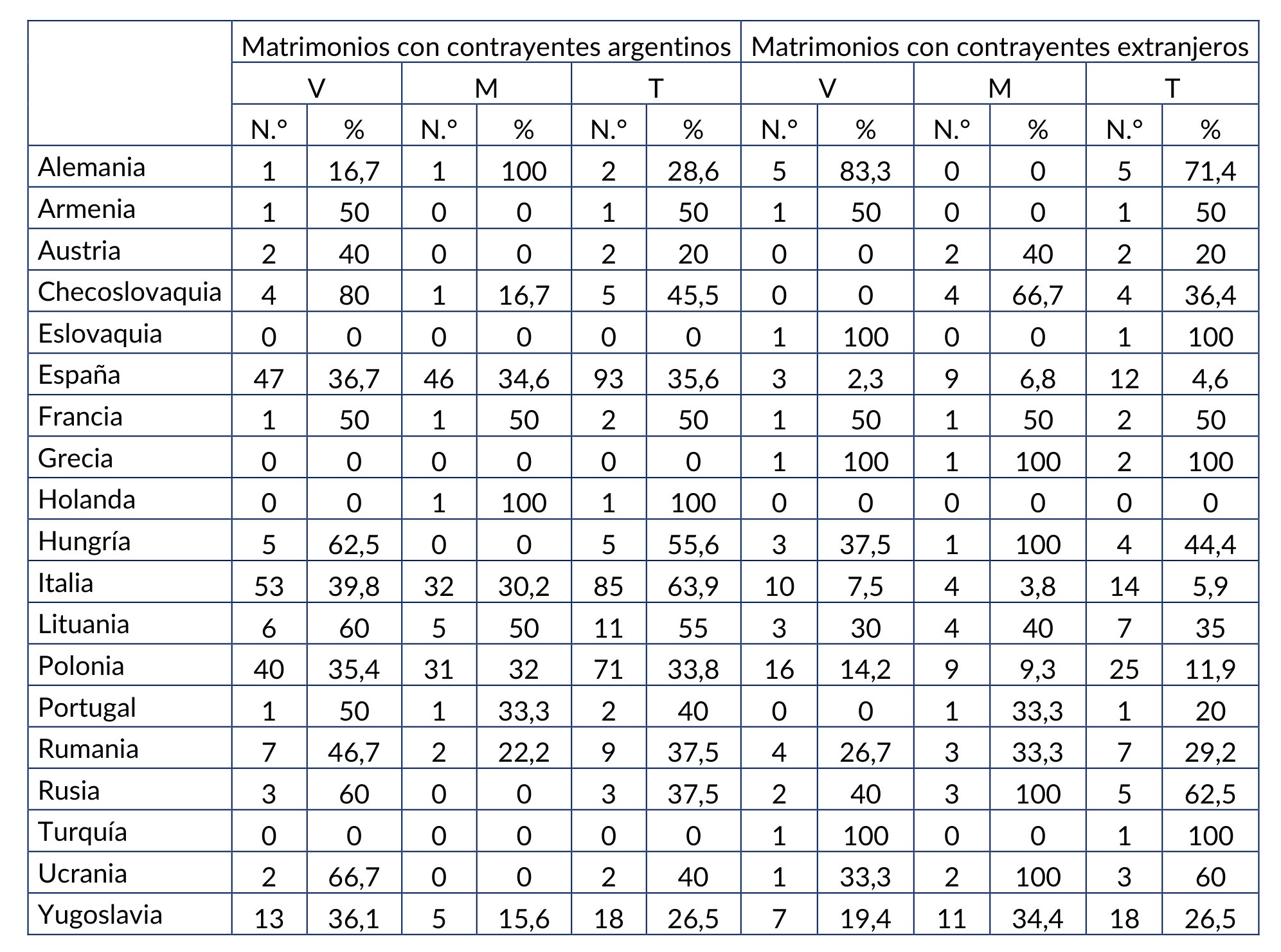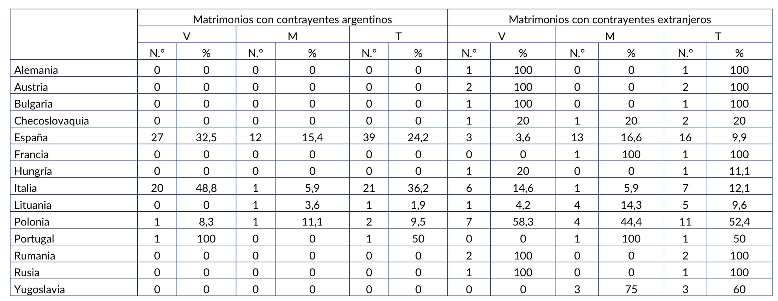 A continuación, pasaremos a ocuparnos de los enlaces efectuados entre 1926 y 1935. Al respecto, la Tabla 21 muestra los números absolutos y las proporciones de los matrimonios endogámicos en los que participaron representantes de los distintos grupos nacionales europeos, tanto para el total de los contrayentes de dicho origen, como diferenciadamente, según el sexo.