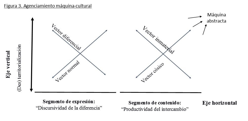 Ahora bien, el eje vertical tiene que encarnarse todavía: ¿cuáles son los aspectos territorializantes de la máquina? ¿Y cuáles la empujan a la desterritorialización? ¿Qué tipo de subjetivaciones instituye? En suma ¿cómo se dinamiza esta máquina? ¿Cuál es su esquema de movimiento? Para pensar estos problemas es necesario dar varios pasos. El primero consiste en deslindar cómo se vincula el modo del agenciamiento propio de la máquina cultural y la noción de máquina abstracta, estrechamente ligada a la de agenciamiento para Deleuze y Guattari.