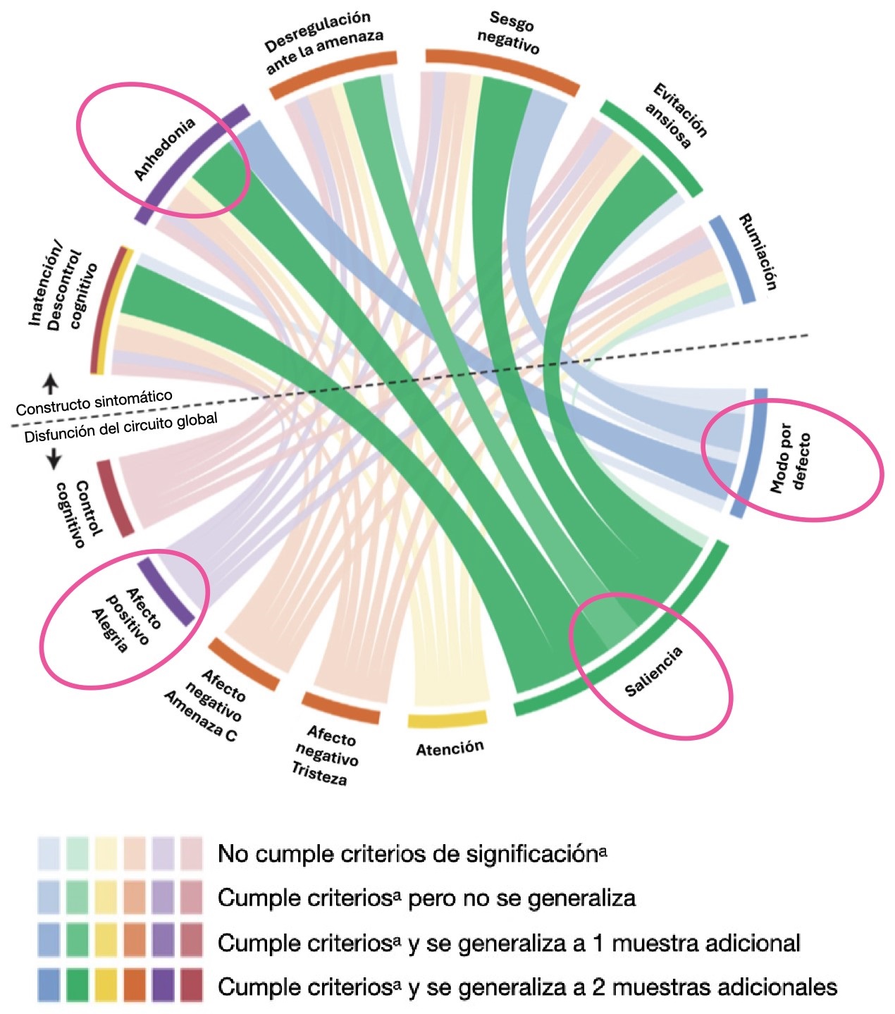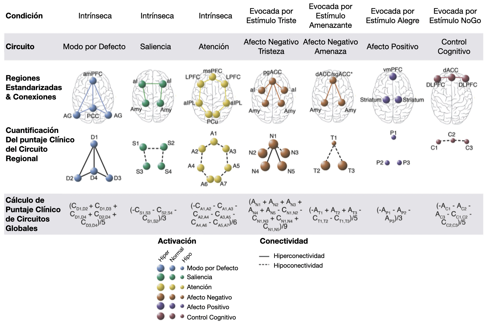 - La red del afecto positivo muestra, como ya se indicó, la hipoconectividad estriatal con la hiperconectividad compensatoria de la corteza orbitofrontal.