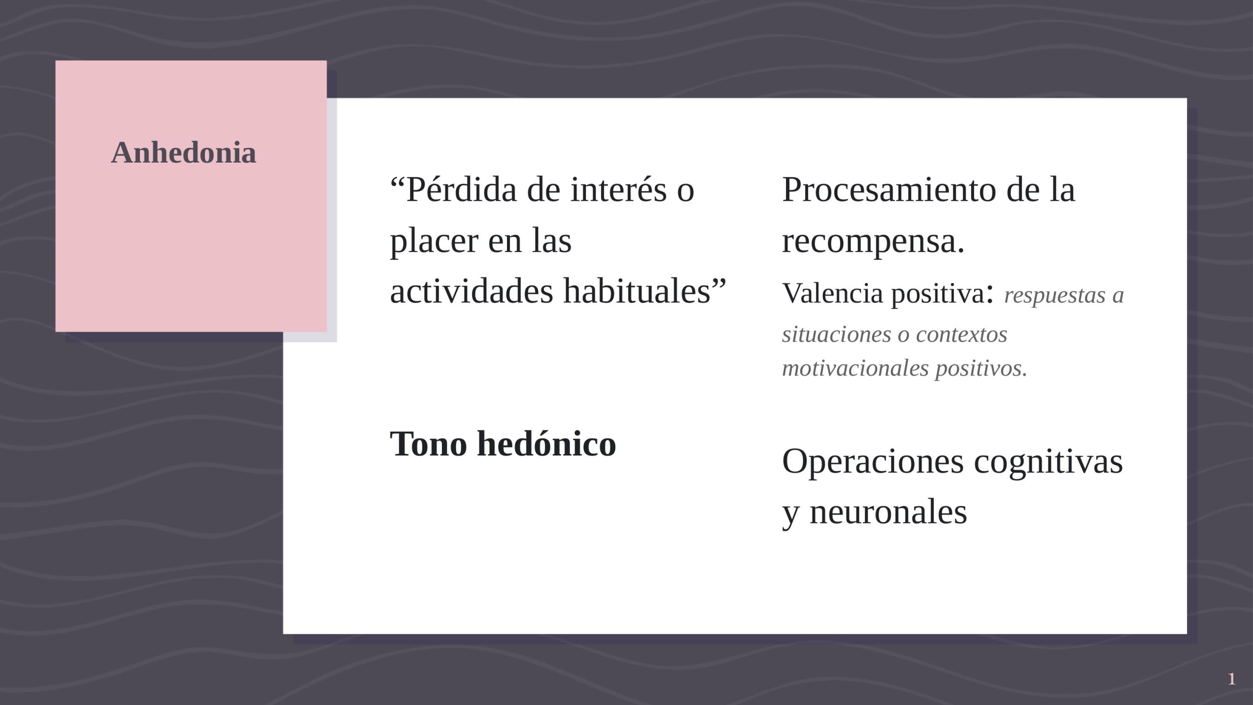 La anhedonia se ha descrito como la pérdida de interés o placer en las actividades habituales. El tono hedónico es el rasgo que subyace a la característica de una persona para sentir placer. Está fuertemente vinculado al procesamiento de la recompensa, e involucra operaciones cognitivas y neuronales.
