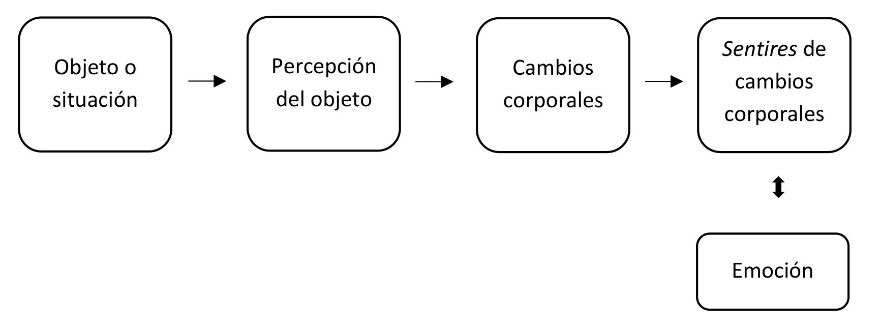 Las emociones son el “sentir” de los cambios corporales, esto es, los cambios corporales son siempre sentidos, y este sentir constituye la emoción. No obstante, cabe señalar que, aun siendo difícil, es conceptualmente posible que los cambios corporales no sean sentidos. Para James, la distancia conceptual entre aquellas alteraciones y su correspondiente sentir consciente era ínfima (o nula). Sería Jesse Prinz, continuador de la teoría somática jamesiana, quien un siglo después trazaría algunas distinciones en el seno de aquello que para James era directo (véase capítulo 4, apartado 4.4).