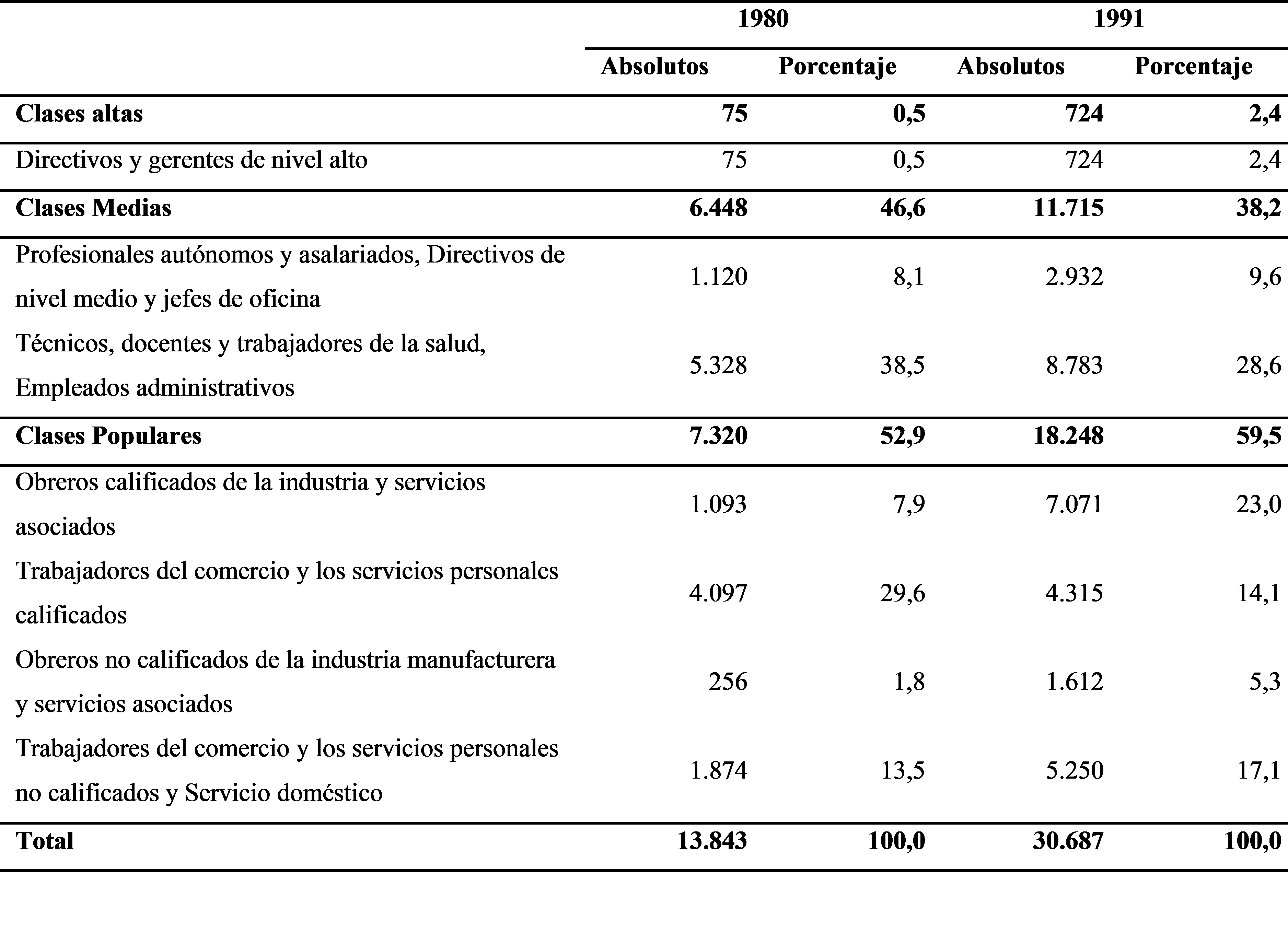 Fuente: Elaboración propia basado en el esquema de clases de Palomino y Dalle (2012, 2016) con información del Censo Nacional de Población, Hogares y Viviendas 1980 y 1991, INDEC.