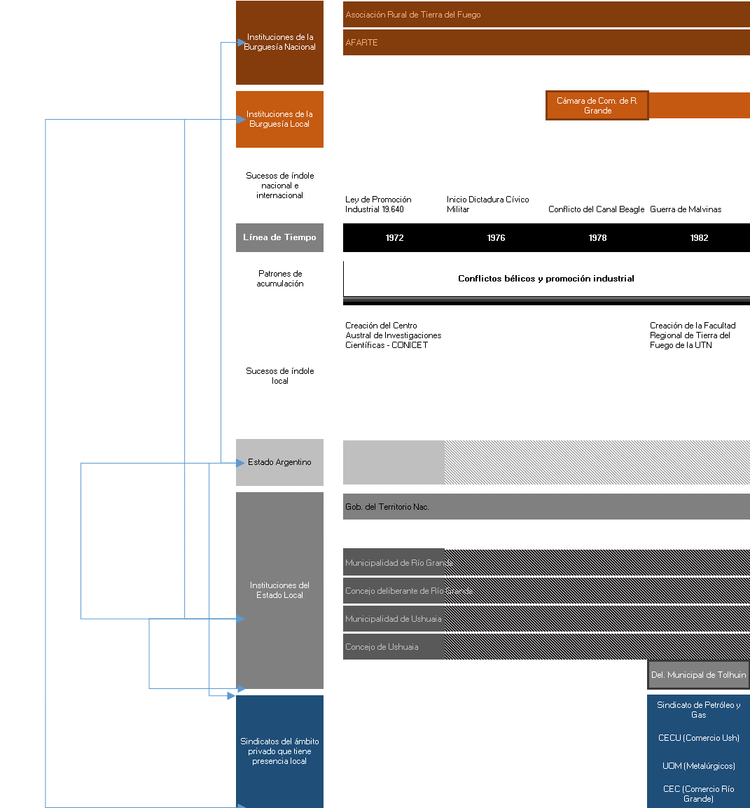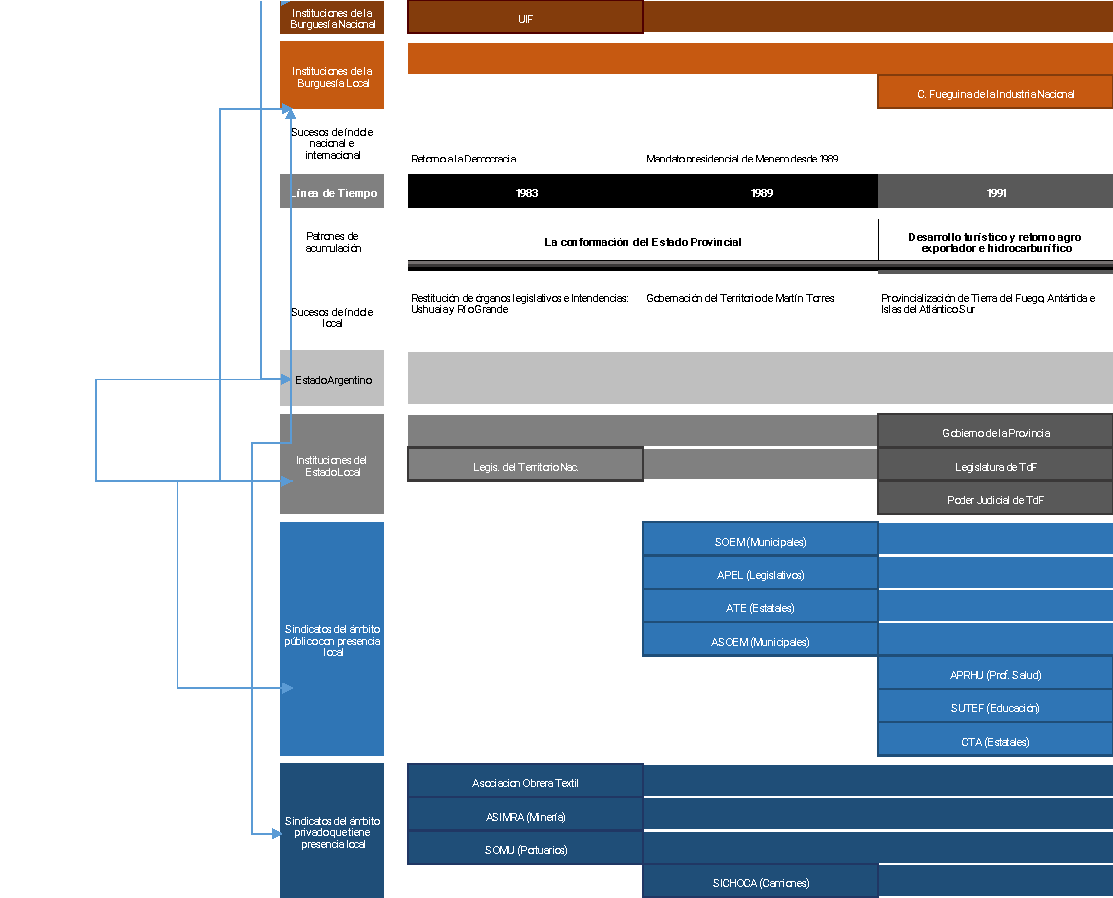 El esquema 2 expresa con claridad la composición de las principales instituciones que se establecieron en la región como expresión del modelo productivo y de acumulación imperante. La Asociación Rural de Tierra del Fuego, Asociación de Fábricas Argentinas Terminales de Electrónica (AFARTE) y la Cámara de Comercio de Río Grande ya estaban configuradas para 1982. De igual forma los dos principales municipios, Ushuaia y Río Grande, y la reciente creada Comuna de Tolhuin en 1972. En representación de los trabajadores encontramos los sindicatos de trabajadores del petróleo, los metalúrgicos y comercio, expresión de los tres sectores económicos más importantes del modelo de desarrollo creciente en el contexto industrial cambiante.
