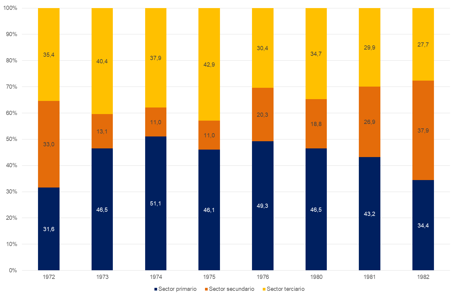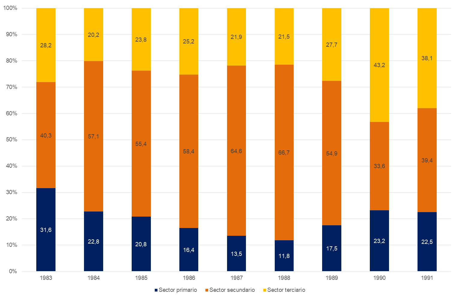 Tal como revisamos en palabras de Miguel Mastrocello (2008) la Ley de Promoción Industrial recibió el impulso de los sectores comerciales y el empresariado local creciente, en base a la necesidad de la diversificación de la estructura productiva. El autor pone en la figura de Mariano Viaña[9] el impulso a la ley, quien además de su rol como empresario rural y del comercio local, fue Ministro de Economía de gobiernos territoriales, y más adelante en los gobiernos provinciales electos del Movimiento Popular Fueguino. El gráfico 1 reproduce una fluctuación de la estructura productiva en sus tres grandes sectores de la economía. Esto se debe a los cambios que comienza a atravesar el Tierra del Fuego producto de los intentos de diversificación productiva de la década de 1960 y de la instalación de las industrias hacia finales de la década de 1970.