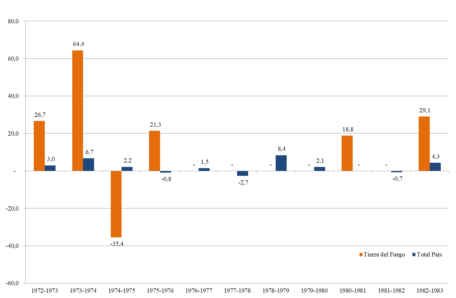 Nota: Para Tierra del Fuego se carece de datos para los años 1976, 1977, 1978, 1979 y 1981. En el caso del Total País se carece del dato de 1979 por cambios en las series.