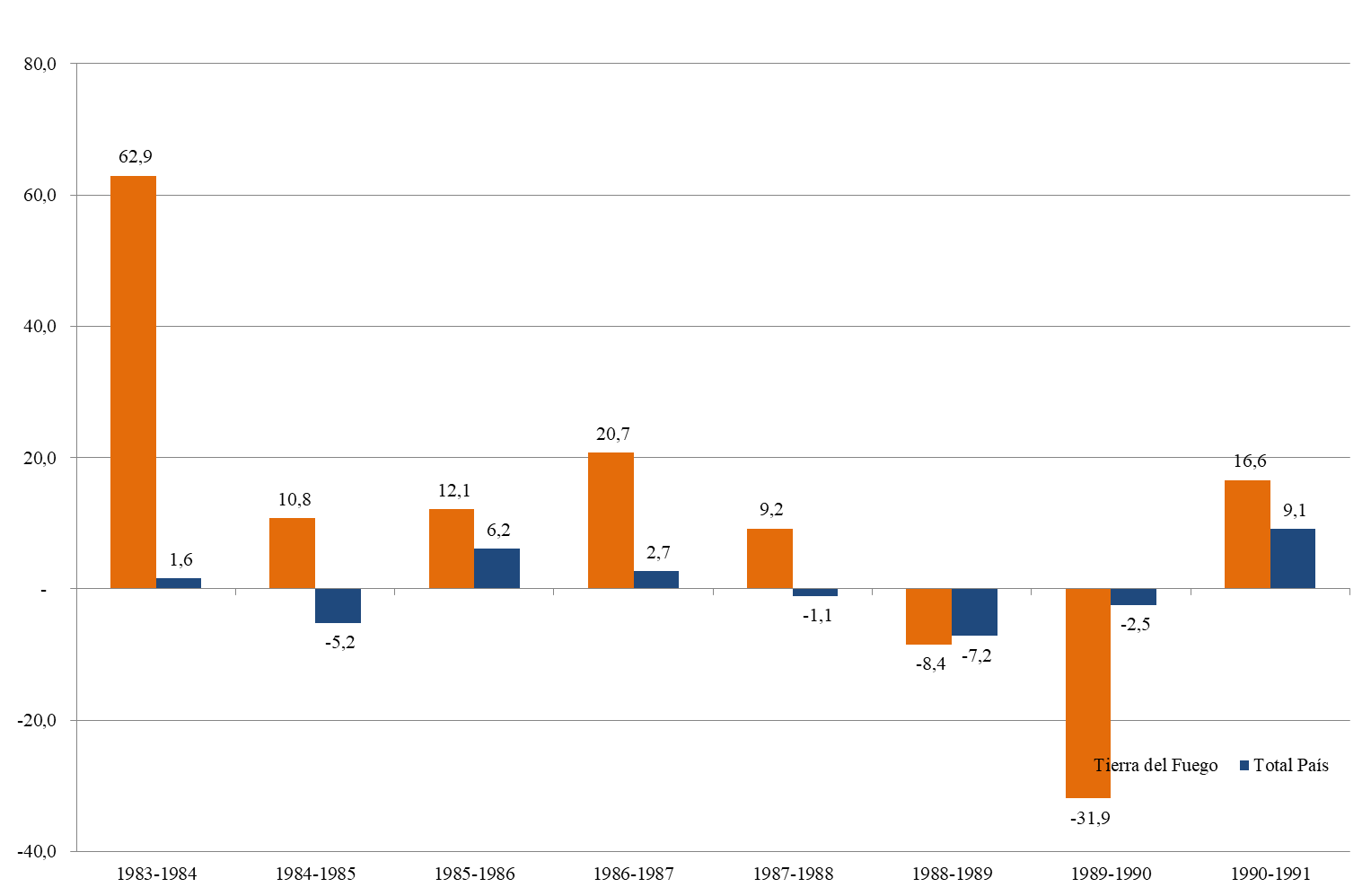 Estas transferencias resultaron beneficiosas para las industrias instaladas en Tierra del Fuego y sostuvieron el proceso de crecimiento a finales de la década de 1970. También tuvieron cierto grado de expresión en el crecimiento del producto regional, tal como manifiesta el gráfico 3, donde a su vez podemos apreciar la “sensibilidad” o tendencia a la variación extrema de la economía fueguina frente al total del país tanto a las crisis como a las recuperaciones.
