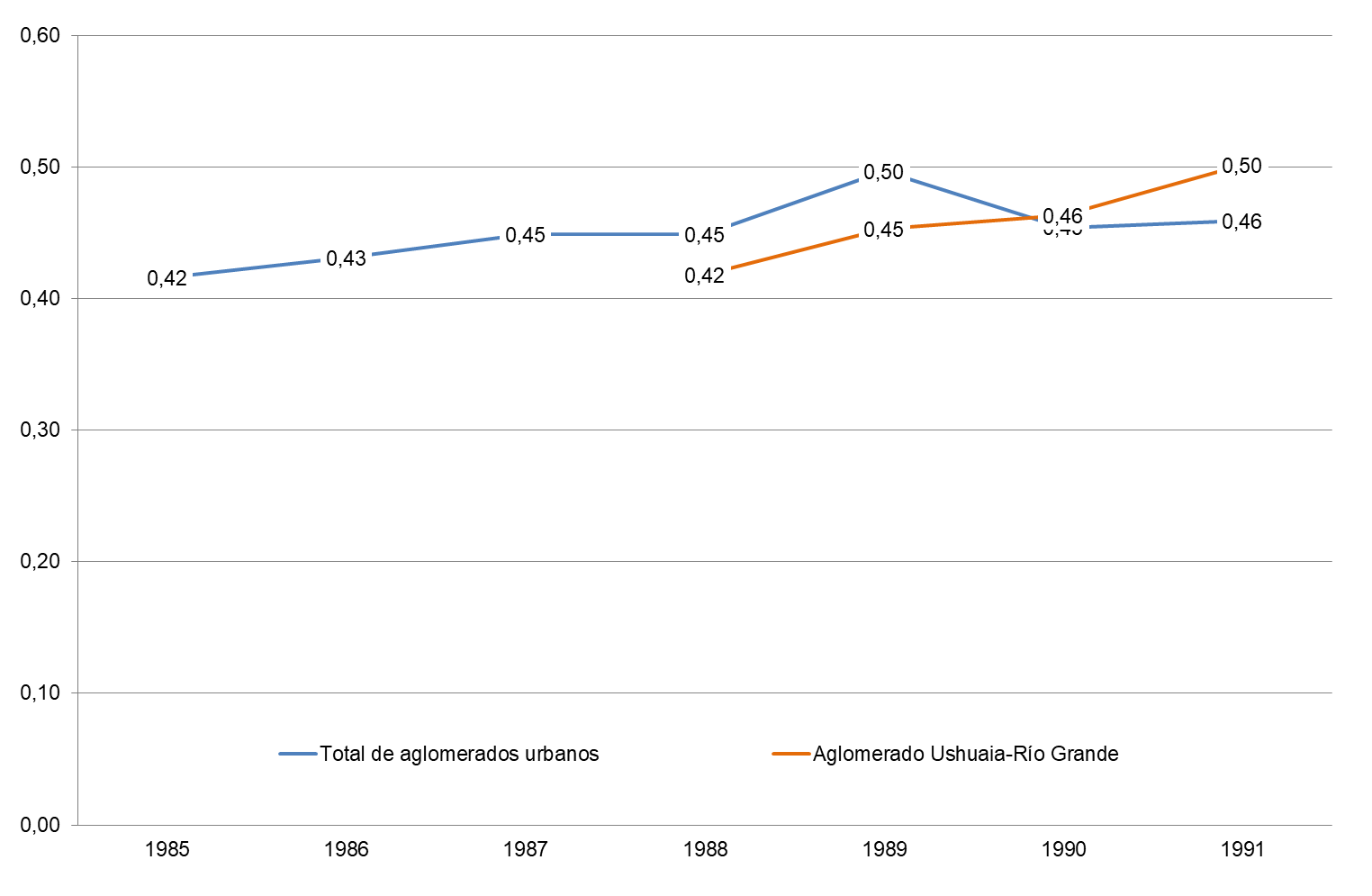 Gráfico 4. Evolución del Coeficiente de Gini del ingreso per cápita familiar de la población. Total aglomerados urbanos y aglomerado Ushuaia-Río Grande. Años 1985 a 1991