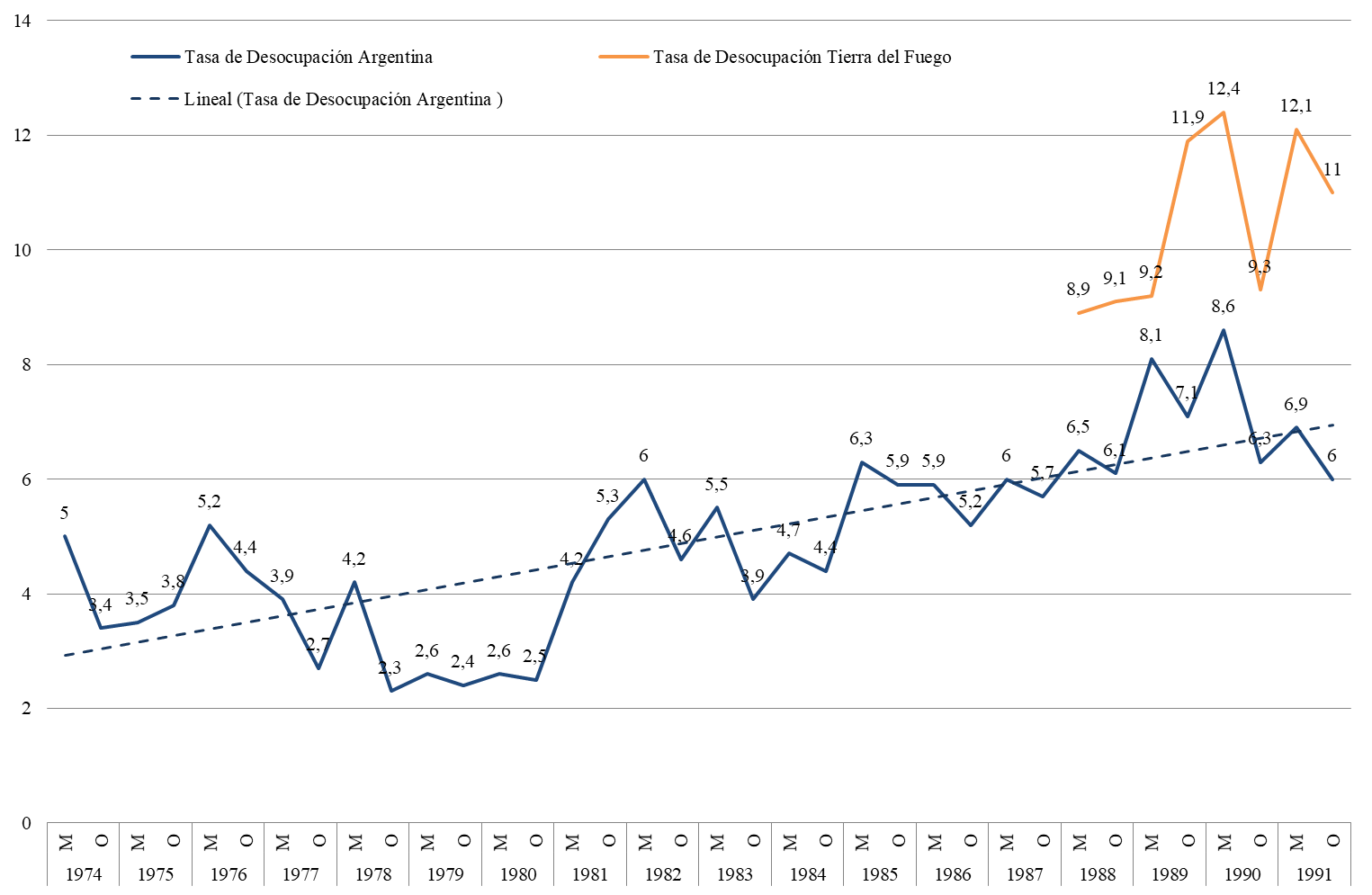 Gráfico 5. Tasa de desocupación. Argentina y Tierra del Fuego. Años 1974-1991