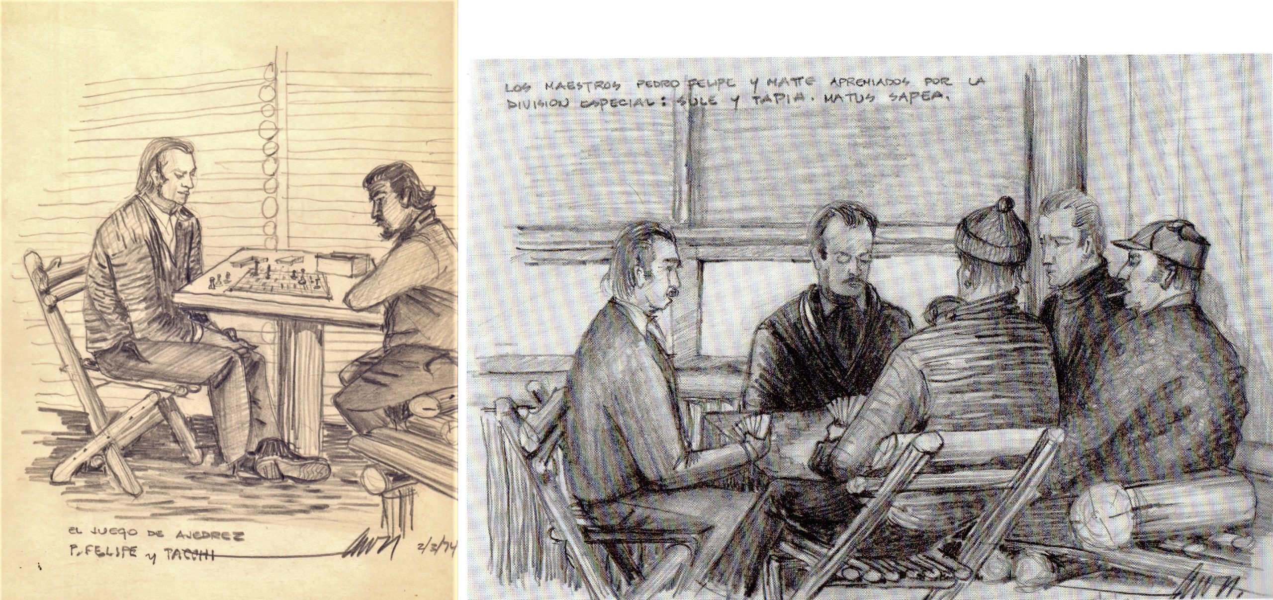 Imagen 1. Ajedrez y naipes en Isla Dawson. Dibujos de Miguel Lawner, 1974 (Fondo Miguel Lawner Steiman. Museo de la Memoria y los Derechos Humanos. Santiago, Chile).